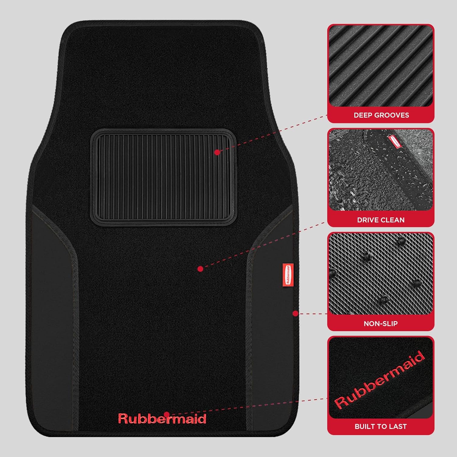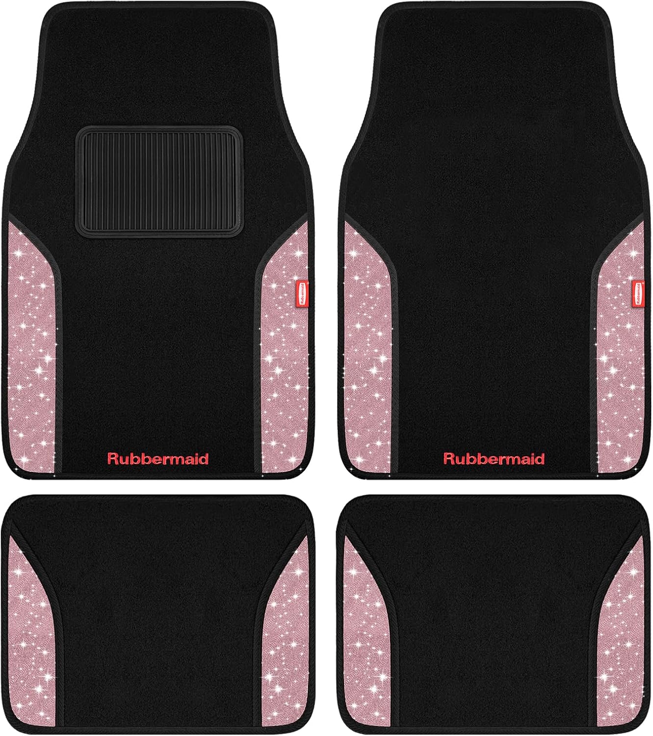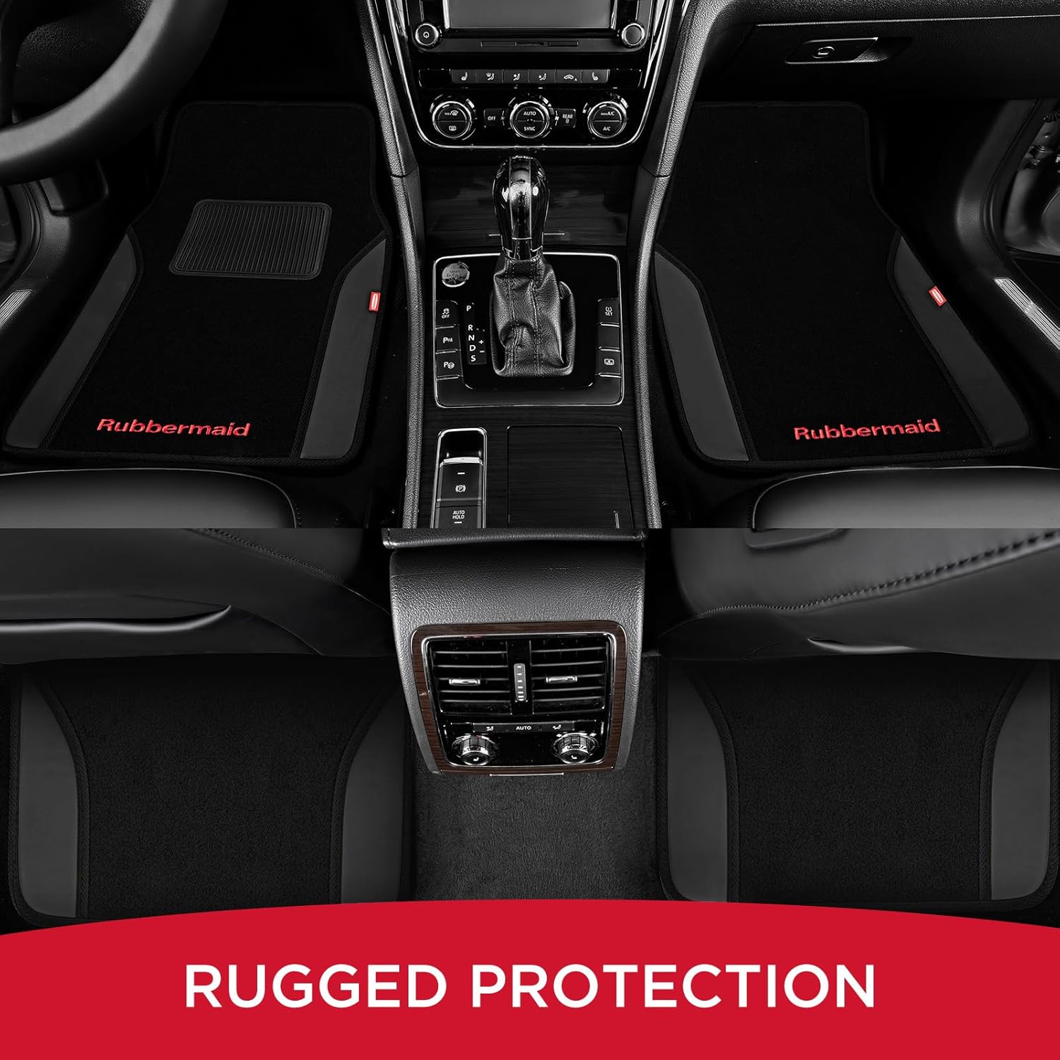 Rubbermaid Car Mats, Carpeted Floor Car Mat with Faux Leather & Built-in Heel Pad, Two-Tone Car Rug Floor Mats, Stylish Carpeted Floor Mats for Cars, Trucks & SUVs Black Color
