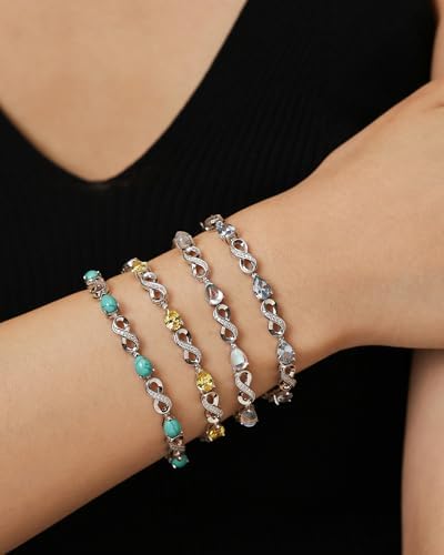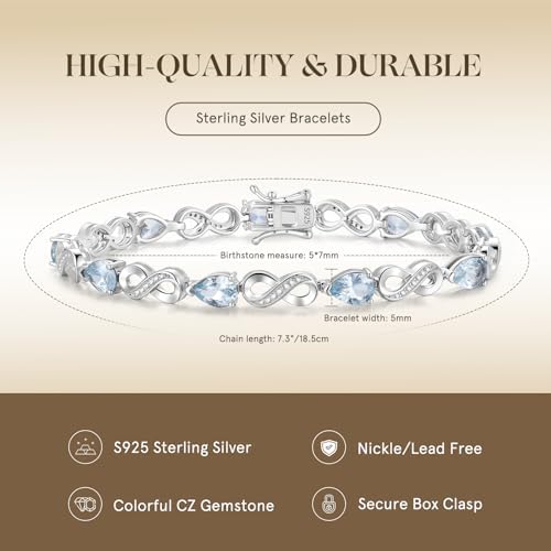 ∞Infinite Embrace∞ The infinity design beautifully captures the concept of everlasting love, incorporating each birthstone by month within the infinity symbol. This symbolizes a warm, unbroken connection, mirroring the enduring nature of the love that this bracelet represents. ∞March Birthstone Jewelry∞ This bracelet is inlaid with stunning and shining gem-quality 5A cubic zirconia, with a simulate aquamarine in the center of the pendant. Aquamarine is the March Birthstone, Represents composure and bravery, happiness and longevity.It also the stone given to celebrate the 19th wedding anniversary. ∞Specifications∞ Birthstone measure: 5*7mm. Bracelet width: 5mm. Chain length: 7.3"/18.5cm. Total weight: 13.5g. ∞Safe Materials∞ All the metals we use are lead free, nickel free. Hypoallergenic sterling silver with real white gold plated, polished to mirror the clarity of your affection. ∞Gifts That Whisper Forever∞ This isn’t just jewelry. It’s a whispered promise, a keepsake of shared sunsets and laughter that echoes through years. Our jewelry makes a sentimental surprise and a great gift for Birthday, Anniversaries, Valentine's Day, Mother's Day, Christmas, Graduation or Wedding celebration.