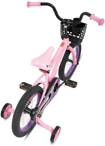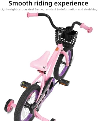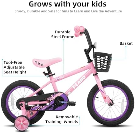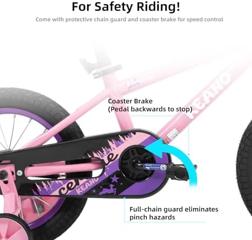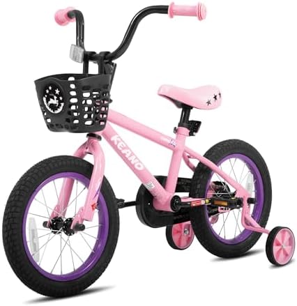 Sport Design for Kids - The KEANO 14 Inch Kids' Bike comes with an cute basket, and training wheels. They turn each ride into a wonderful journey, making it highly appealing to young kids at first sight Enjoy a safer ride! This bike has a rear coaster/foot brake for good stopping power. Wide 2.125" pneumatic tires add stability. It also includes a strong steel frame, an enclosed chainguard, and reflectors on the front, rear, and wheels Designed for Young Riders - This bike includes removable training wheels for learning. For a comfortable and easy pedaling experience, both the saddle and stem height are adjustable. Its simple single-speed drivetrain makes maneuvering effortless for children Easy to Assemble - Get riding quickly! The children's bike arrives 85% pre-assembled with basic assembly tools included. A novice can typically complete assembly in about 20 minutes. Plus, it's backed by our limited lifetime warranty. Best Gift for Kids - This 14-inch kids' bike is the perfect gift for children aged 3-5 years old. It's a fantastic way for kids to engage in physical activity, enhance their coordination, boost their confidence, and enjoy endless fun and adventure