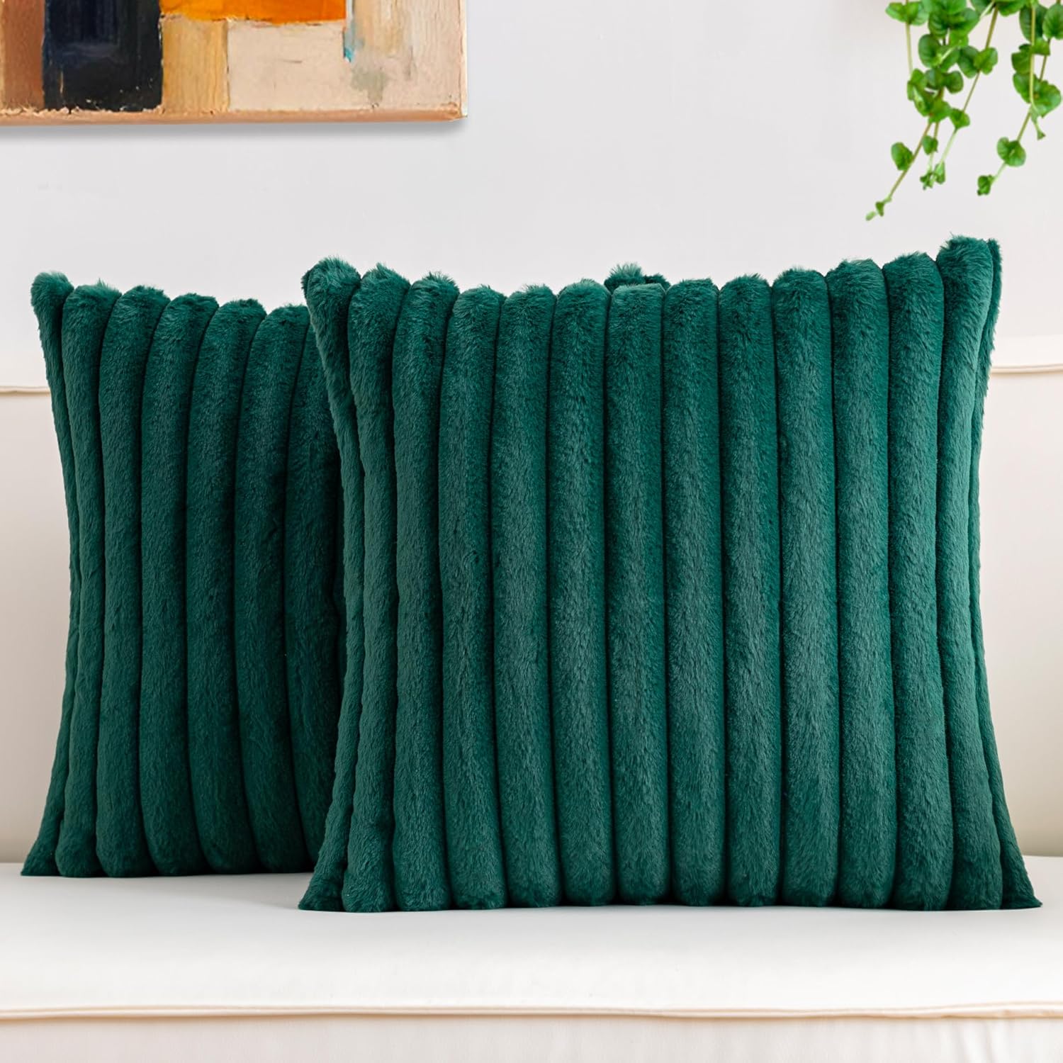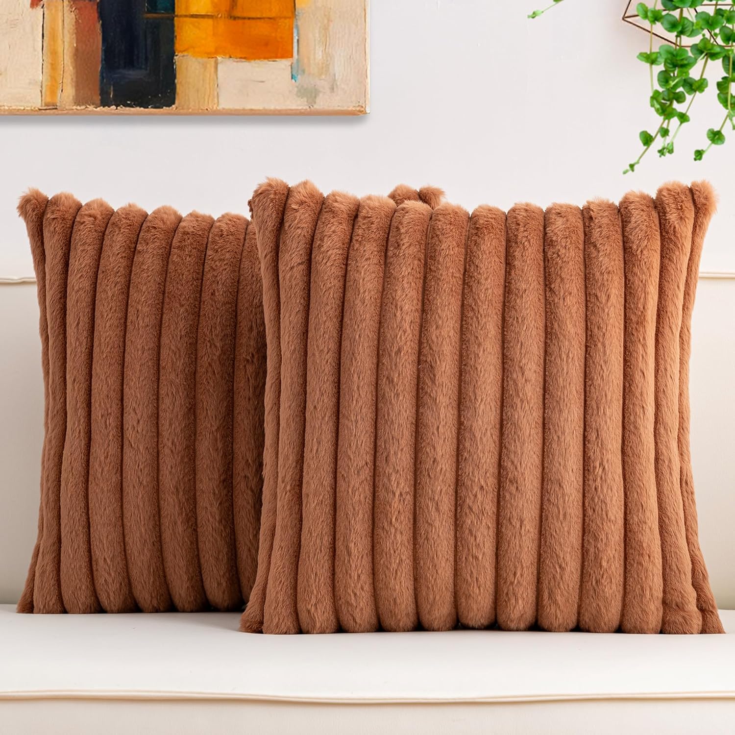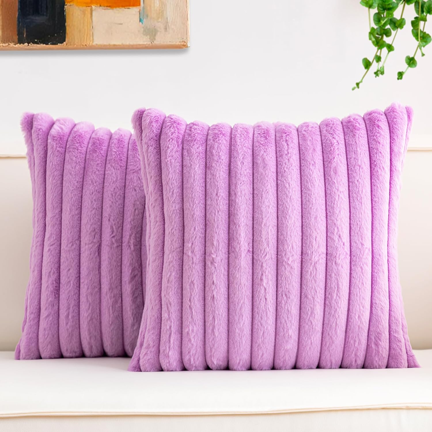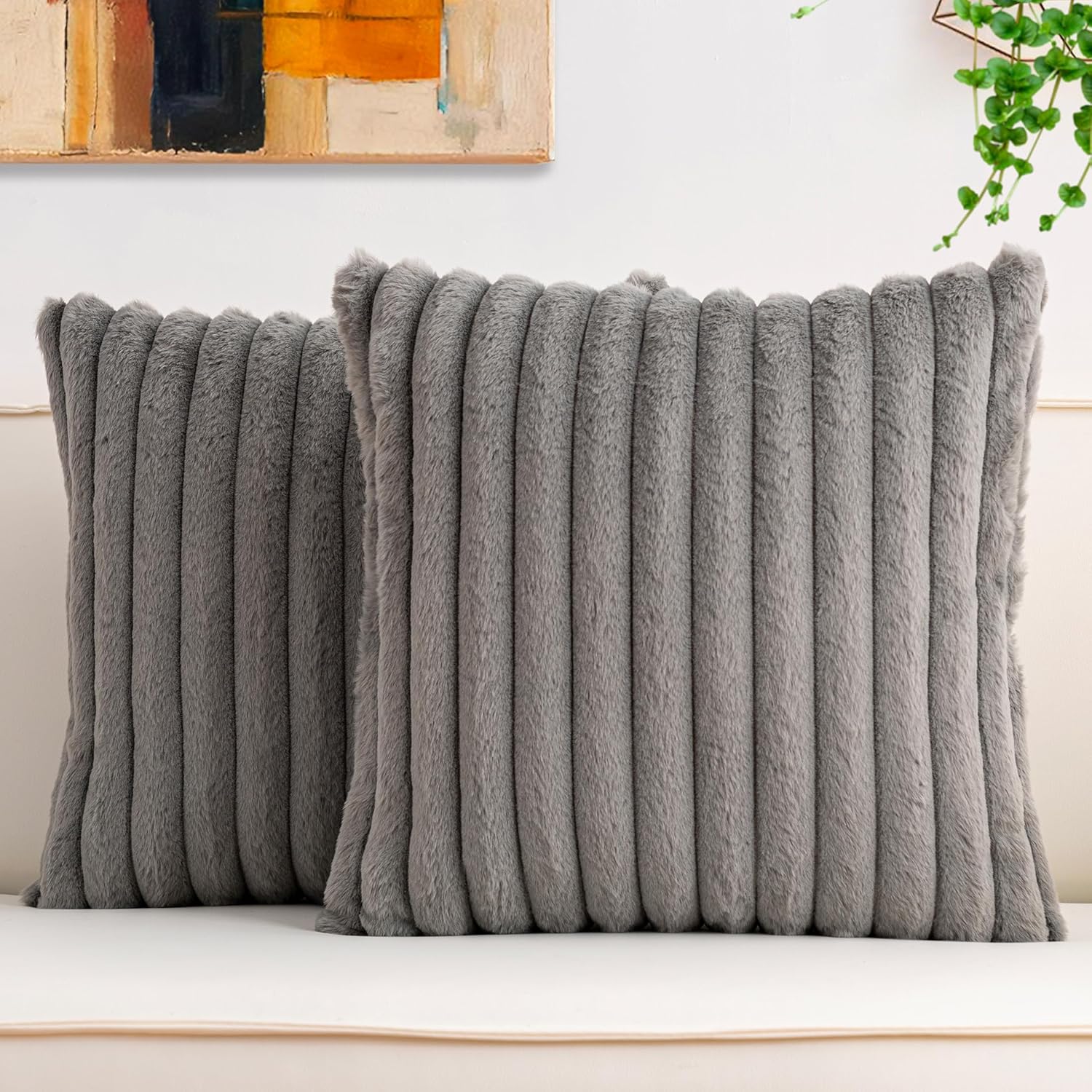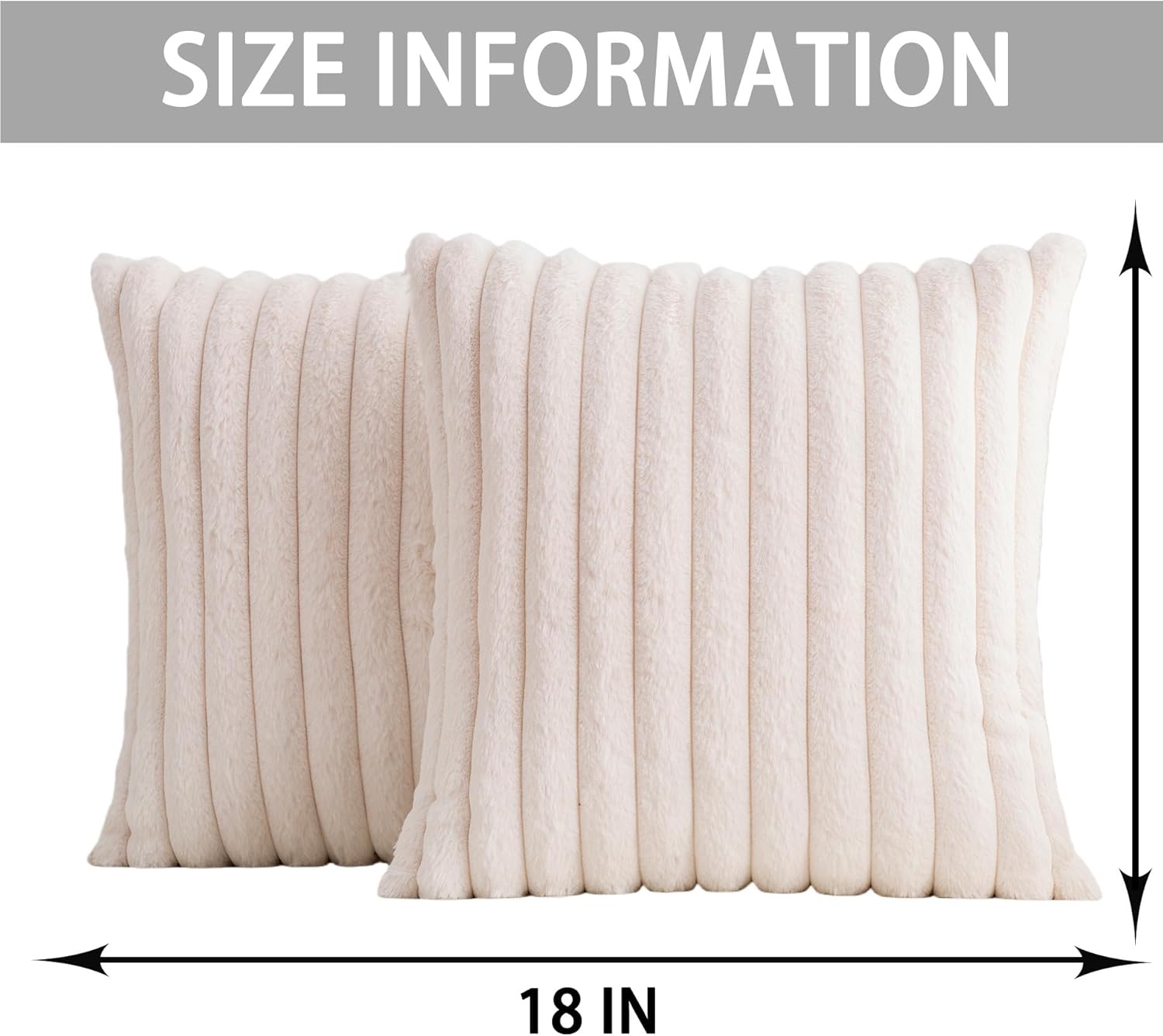Aegero Pack of 2 Faux Fur Christmas Throw Pillow Covers 18x18 Inch, Soft Plush Striped Neutral Couch Pillow Cover, with Velvet Back Modern Home Decor for Sofa Living Room Couch Bed Cream White