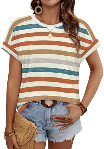 Material: 95%Polyester,5%Spandex. The fabric is soft and comfortable, it's perfect for wearing all day long. Feature: The basic shirts, classic crewneck, cap sleeve, add a unique design to the summer tops, making the basic t-shirts more fashionable. Match: The women short sleeve shirts is perfect tuck in or out,the version is loose enough so it is also can be knotted on the front or side to make you more spicy. Occasion: Chic casual shirts are suitable most occasions, especially daily wear/ work/ business/ casual / outdoor/ exercise/ yoga/ trip vacation wear/ event. Tips: Please check the size chart carefully before buying.