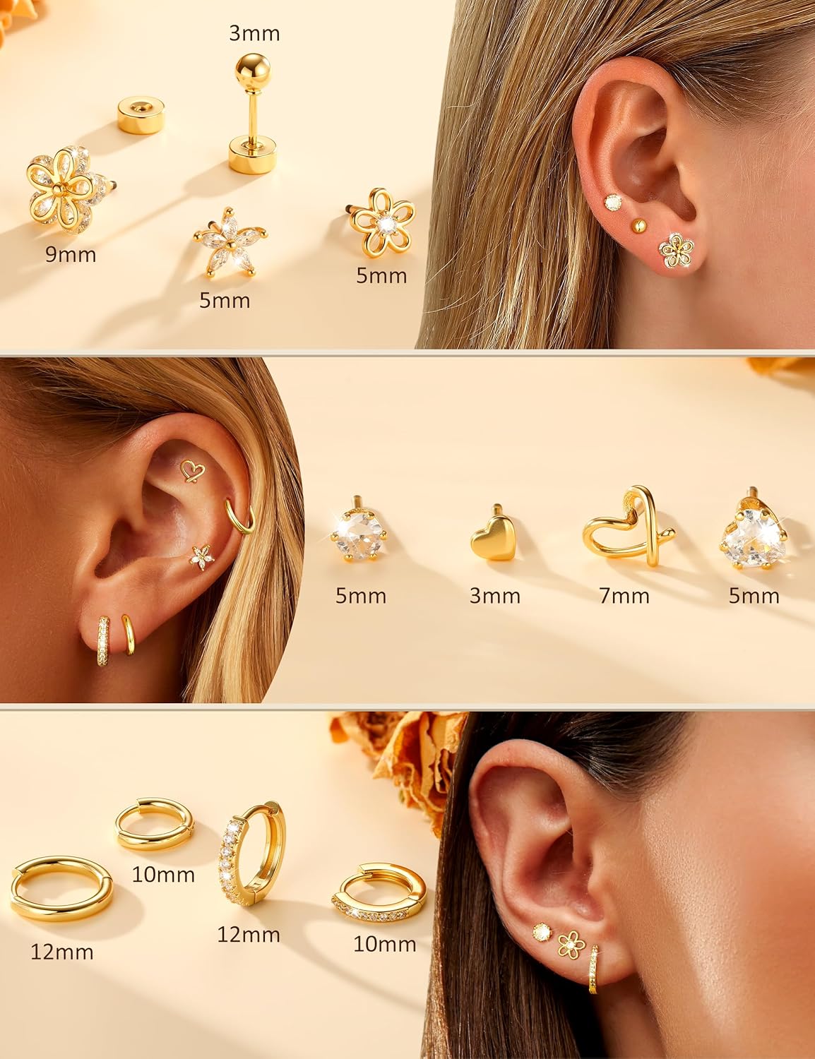 Versatile Set of Gold Stud and Hoop Earrings:This luxurious set includes multiple pairs of Gold Earrings, featuring timeless Stud Earrings and elegant Hoop Earrings. Perfect for creating stacked looks, these 14k Gold Plated earrings are designed for various piercings like cartilage, helix, and lobe, offering endless styling possibilities.