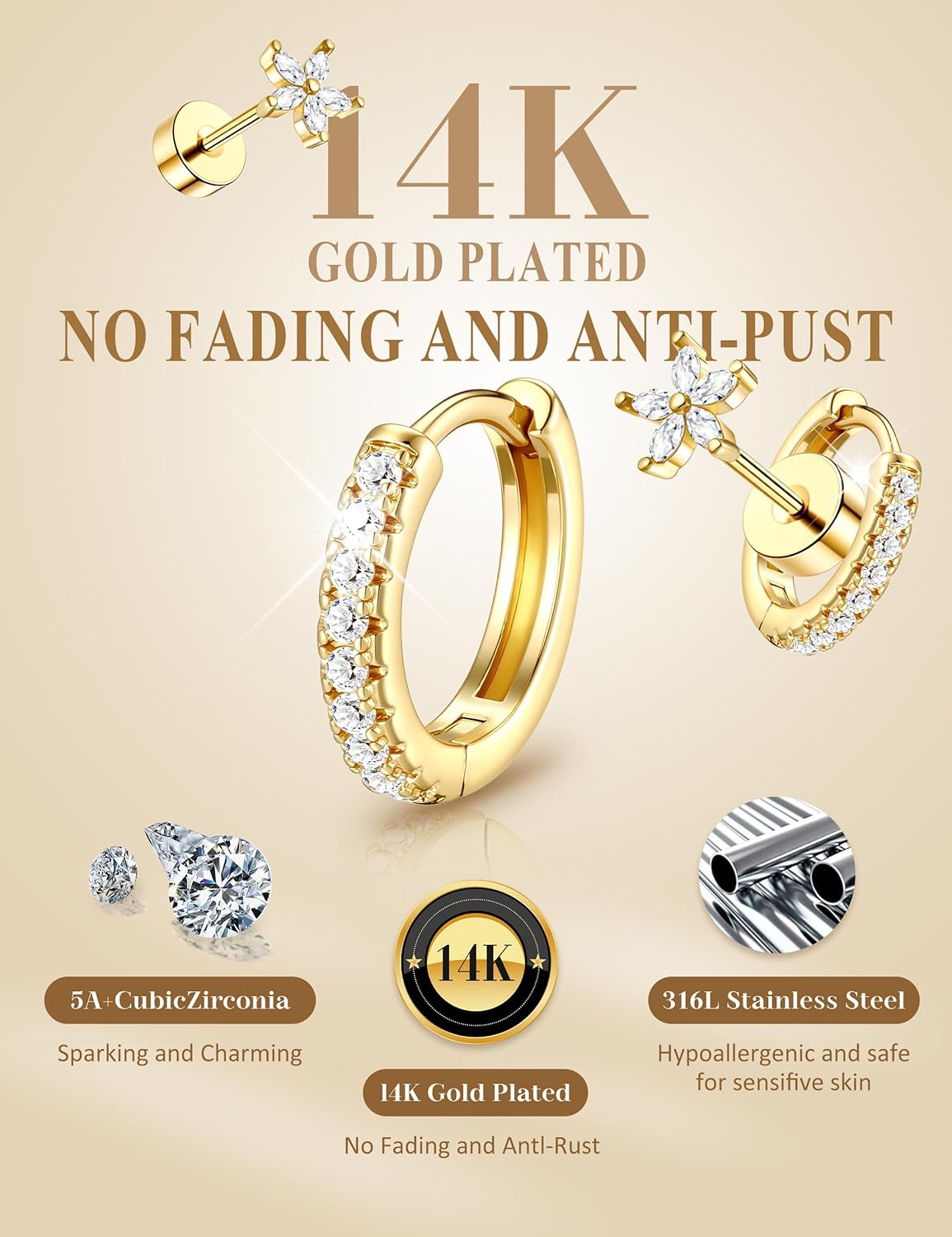 Premium Hypoallergenic Earrings for Sensitive Ears:Crafted from premium 316L Surgical Stainless Steel earrings, these 14k Gold Plated earrings are rigorously tested to be nickel-free and lead-free. These Hypoallergenic earrings are perfectly safe for sensitive ears, ensuring no irritation with a comfortable, secure fit for everyday 24/7 wear.