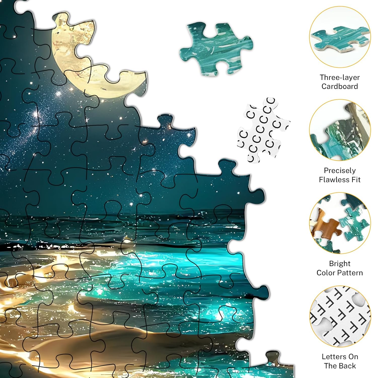 High Quality Materials: Crafted from three-layer thickened cardboard by precision cutting and high-definition printing, our Moonlight puzzles for adults 1000 pieces ensure lasting durability, seamless fitting, and vibrant colors, together with letters on the back for systematic assembly.