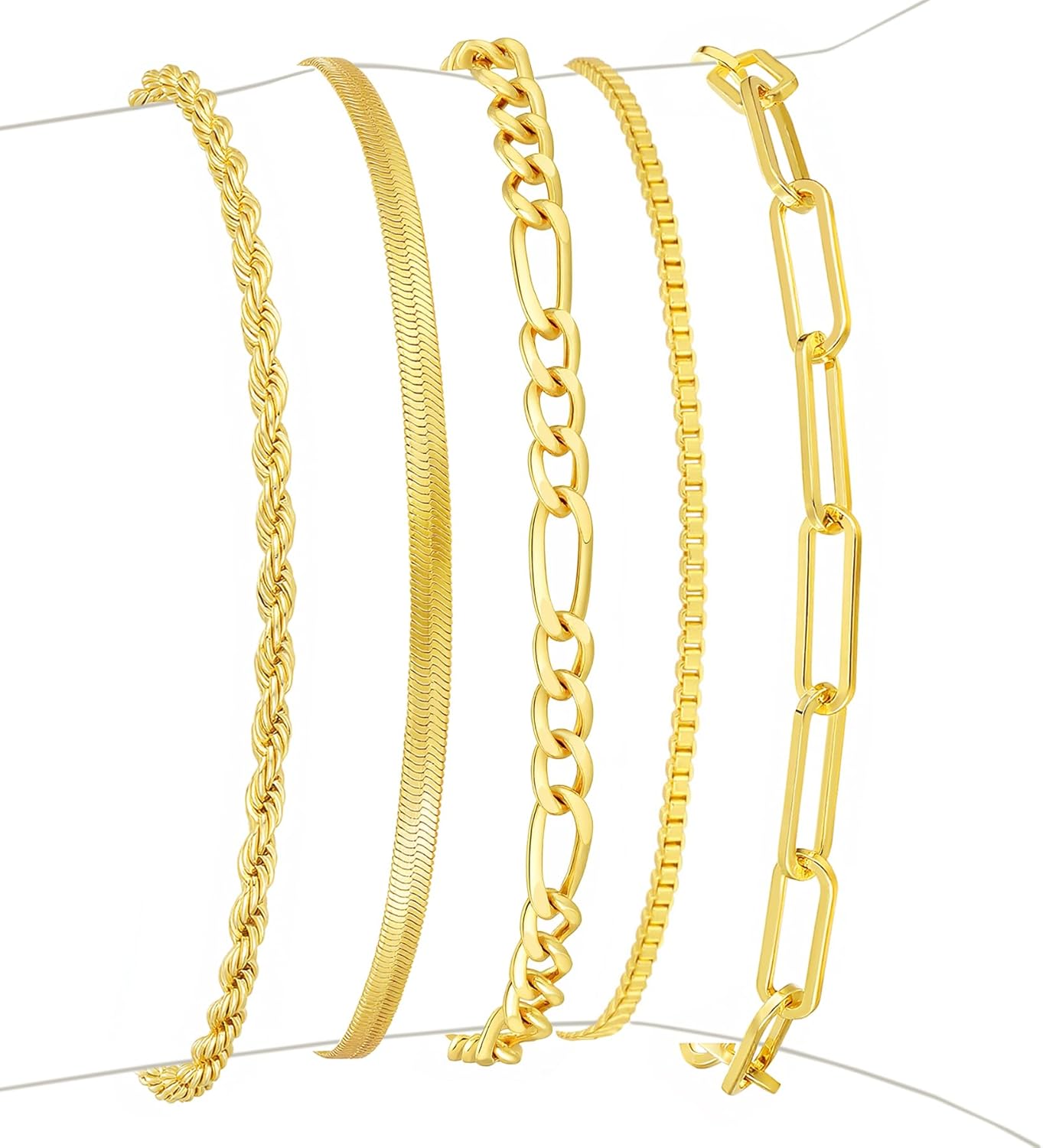 14K Gold Plated 5-Piece Bracelets Collection: Comprises Small Disc Chain, Satellite Chain, Wave Twisted Rope Chain, Flat Oval Chain, and Gold Bead Box Chain. Each dainty bracelet shines with a luxe, high-polish finish, creating a layered look that’s lightweight yet eye-catching—perfect for everyday wear or special occasions