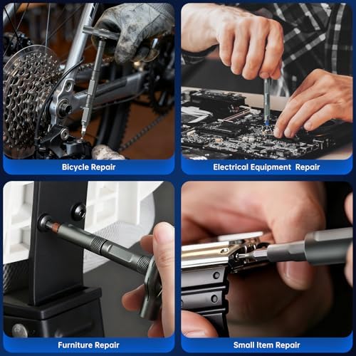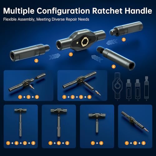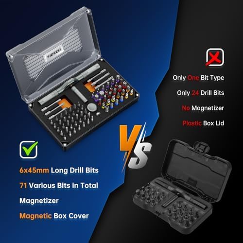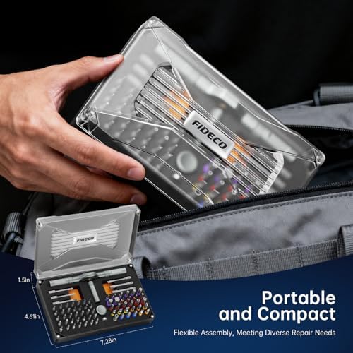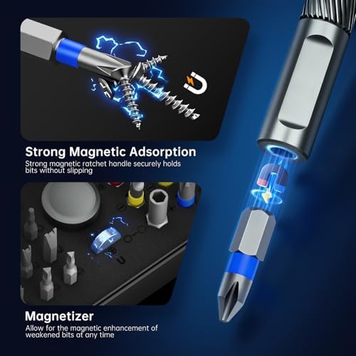 【Magnetic Screwdriver for Effortless Precision】Tired of screws slipping and falling in hard-to-reach places? FIDECO ratcheting screwdriver features an ultra-strong magnetic tip that securely grips screws, preventing drops and frustrations during intricate tasks. Whether you're assembling furniture in your living room or repairing electronics on a ladder, this durable magnetism ensures smooth, one-handed operation—saving you time and hassle. No more searching for lost screws; enjoy a seamless experience from start to finish! 【Versatile 74-in-1 Screwdriver Set】Why clutter your toolbox with multiple tools when one can do it all? FIDECO multifunctional ratchet screwdriver set adapts to any scenario, from quick home fixes to complex automotive repairs. Easily switch between bits and handles to tackle DIY projects, workshop tasks, or emergency maintenance. Imagine having a compact, go-to kit that handles everything—loosening bolts, driving screws, or adjusting appliances—making it your ultimate partner for every job. 【S2 Chrome Molybdenum Steel Bits】Say goodbye to brittle bits that snap under pressure! Our screwdriver bits are crafted from premium S2 alloy steel using CNC milling and continuous heat treatment, ensuring they are hard yet flexible to resist wear and breakage. Perfect for drilling into tough materials like metal or wood, these bits excel in home renovations, professional work, and hobby DIY. From mounting shelves to fixing bicycles, you get reliable performance that stands up to daily demands. 【80% Effort-Saving Ratchet Mechanism】Struggling with stiff screws in tight spaces? The T-handle incorporates a 6.2-degree ratchet angle and 58-tooth reversible mechanism, reducing applied force by 80% for smooth operation in confined areas. Picture yourself effortlessly tightening bolts under a car hood or assembling cabinets in corners—this design maximizes leverage and minimizes fatigue, turning challenging tasks into quick, one-handed achievements. 【Color-Coded Bit】Never waste time searching for the right bit again! Our intuitive color-coded rings let you spot and grab the correct bit in seconds, whether you are in a dimly lit garage or mid-project rush. Ideal for organized DIYers and pros, this feature streamlines your workflow, reduces errors, and keeps your workspace tidy. Enjoy a stress-free experience where every bit is at your fingertips, ready to tackle any repair or creative project. 【Perfect Gift for DIY Enthusiasts】FIDECO magnetic ratchet screwdriver set is a good and practical gift for DIY enthusiast. It is also a great gift for Christmas, birthday, Father's Day or any special occasion!
