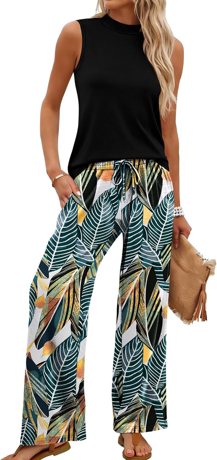 WIHOLL Two Piece Set for Women Summer Spring Outfits Cruise Travel Airport Beach Vacation Mock Neck Wide Leg Pants Set