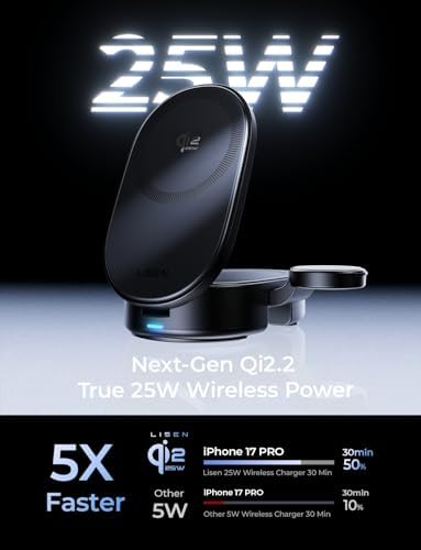 [Ultra-Compact Foldable Design] This 3 in 1 charging station's phone charging panel opens up to 65°, bottom earbud pad rotates 180°, and the entire 3-in-1 charger folds down to just 3.94 × 2.44 × 1.23 inches; weighing only 6.35 oz, it easily fits into a backpack, handbag, or carry-on, making it ideal for travel, office desks, and bedside charging setups. [Qi2.2 Ultra-Fast Wireless Charging]This Magnetic Wireless Charger with Qi2.2 Ultra-Fast Wireless Charging – supports up to 25W wireless output for iPhone, fully charging iPhone 17 Pro Max in approximately 1 hour 45 minutes, and reaching 60% in just 30 minutes, ideal for fast charging during busy mornings, work breaks, or short rest periods. [Heat-Isolation Cooling Design] The 3 in 1 Magsafe Charger is equipped with the separated PCBA heat-dissipation plate reduces heat transfer during charging, preventing overheating and maintaining stable performance during overnight charging or long desk use, while helping protect long-term iPhone battery health. [Rock-solid stability]The qi2 25W magsafe charger built-in 1200 g magnetic force keeps your iPhone precisely aligned for efficient Qi2.2 charging, while the silicone anti-slip base prevents movement on desks or nightstands, ensuring stable use in both portrait and landscape orientations. [Power Compatibility Statement] The LISEN 3 in 1 Wireless Charger supports Qi2.2 25W for iPhone 17 Pro / 17 Pro Max / 17, Qi2.2 20W for iPhone 16 / 16 Pro / 15 series, and wireless charging for Apple Watch (all series) and AirPods; designed exclusively for Apple devices and optimized for stable daily charging. [What's in the box]1* Qi2.2 3-in-1 wireless charging station, 1* 45W power adapter, 1* 3.3 ft (1 m) nylon-braided 60W USB-C to USB-C cable, 1*Manual, 24/7 Customer Support