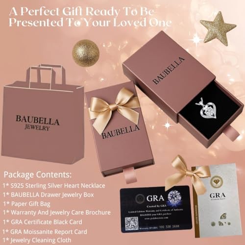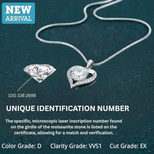 ? The Symbol of Eternal Love: More than just a necklace, this piece is a promise. Featuring a classic heart-shaped design, a universal symbol of devotion, it perfectly complements the enduring nature of the center moissanite diamond. Together, they represent an eternal commitment, beautifully symbolizing the lasting protection and beauty of your love. Every time she fastens this heart necklace, she'll recall the treasured moments you've shared and feel the depth of your affection. ✨Unparalleled Brilliance: Prepare for a sparkle that truly captivates. This necklace showcases a brilliant 1-carat moissanite diamond with a perfect D color rating. Moissanite is celebrated for its incredible brilliance and fire—boasting 2.5 times the fire of a diamond! With 92.5% of the hardness of a natural diamond, its dazzling presence is virtually indistinguishable from its natural counterpart. ? A Secret Message: 'I LOVE YOU' The reverse side of the pendant is subtly and sweetly engraved with the words 'I LOVE YOU'. This hidden message is a heartfelt way to express your deepest love, ensuring she knows just how much she means to you. Crafted from S925 sterling silver and plated with precious rhodium, the necklace is hypoallergenic and comfortable for sensitive skin. The secure chain measures 20 inches (18" with a 2" extension). It's the perfect, unforgettable gift for a wife, girlfriend, mom, or daughter. ? Certified Authenticity: Each moissanite stone is laser-inscribed with a unique authenticity code, visible under 10x magnification, This code demonstrates high quality and establishes your ownership. The necklace also comes complete with a Certified Gem Testing Lab certificate of authenticity. ? Ready to Delight, Designed to Impress: presented in a sophisticated jewelry box and accompanied by a premium paper gift bag, this necklace is thoughtfully packaged to make every occasion feel extraordinary. Whether it’s a birthday, anniversary, Valentine’s Day, or Mother’s Day, it arrives ready to create a lasting memory—no wrapping required, just heartfelt giving.