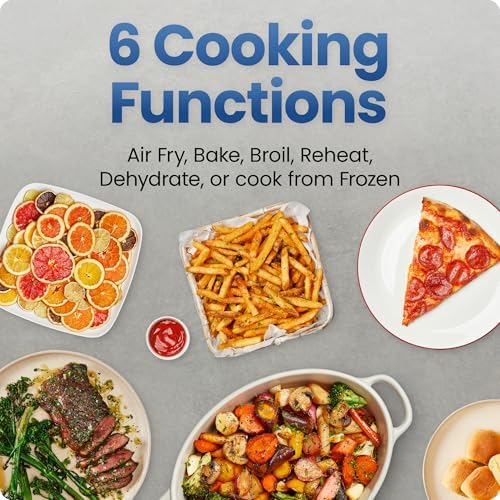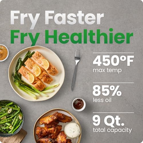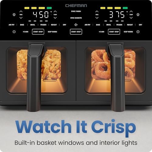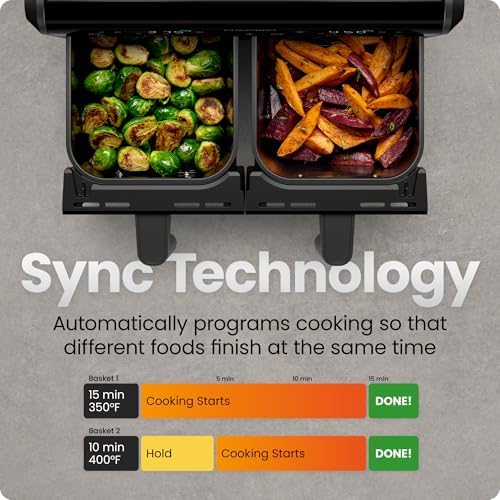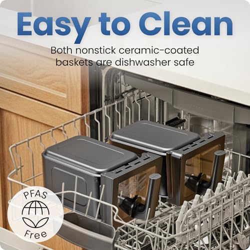 TWICE THE FOOD, HALF THE TIME: Enjoy extra-crispy meals and prepare your favorite main course along with a side dish, all in one multifunctional airfryer! This double air fryer has two separate 4.5-quart baskets for one-stop convenience. SUPERCHARGED VERSATILITY: This DC motor air fryer features a fan with unmatched customizability, changing the speed for everything from rapid convection heating to an accurate broiler or dehydrator. COOK TWO FOODS AT ONCE: With independent touchscreen controls, set your time, temperature, and cooking function separately for each digital air fryer basket. Get two air fryers and one seamless kitchen appliance. 450°F MAX TEMPERATURE: While most airfryers can only heat up to 400°F, the TurboFry air fryer can maintain a temperature of 450°F for the entire cooking cycle. Get more crisp in every bite, in only a fraction of the time. 6 VERSATILE FUNCTIONS: With Air Fry, Bake, Broil, Reheat, Dehydrate, or Frozen, you can cook almost any meal in this one large air fryer. Plus, you can keep your food warm for a perfect serving experience. SYNC TECHNOLOGY: Built for convenience, this dual basket air fryer has two sync options for cooking. Sync Baskets matches one basket’s cooking settings to the other, and Sync Finish ensures both baskets finish cooking at the same time. PFAS-FREE BASKETS: Each basket is coated with a food-safe nonstick ceramic coating, for a fully non toxic air fryer experience. Each basket features an easy-view window to keep an eye on your food as it cooks.