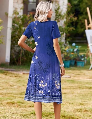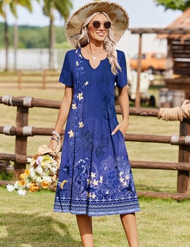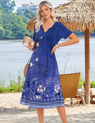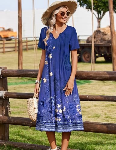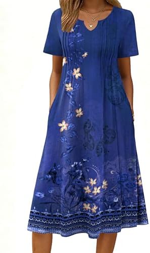【High quality】: Solid color dress made of 60% polyester 35% viscose 5% spandex,floral dress is 95% polyester5% spandex.stretch casual dress is soft,skin-friendly,breathable and comfy. this lightweight and flowy dress keeps you cool in summer 【Unique design】: The pleated front style,a-line silhouette and flowing hemline gives a slimming effect to the waist as it cinches it in and looks elegant.fit for all body types 【Features】: Casual dress with pockets,henley v neck dress,pleated front flowy dress, short sleeve midi dress, floral print dress,pullover dress, flattering cut, aline flare dress,below knee length dress.the fabric neither thin nor thick,not see through 【Match:】Women midi dress is very versatile and can be worn dressed up or casually.you can wear it with sandals or sneakers for a casual look, or pair it with belt,heel,sungrass for a fashionable look.also you can pair it with a lightweight cardigan for a spring chic look 【Occasion:】The dressy dress for women 2026/,v neck dress/ long summer dress/vacation beach sundress/tropical dress/fit and flare fress/holiday dress/ladies tshirt dress/ loose dress are perfect for daily wear, casual,home,work, office, business, shopping, dates,street,lounging out,parties,church, going out, vocation,holidays, travel, beach and any occasion