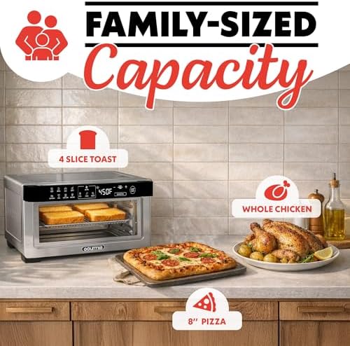 12 Preset Functions – Air fry, bake, roast, toast, bagel, fries, wings, snacks, broil, dehydrate, popcorn and keep warm with a single tap. FryForce 360° Technology – Perfect for healthier cooking, rapid airflow circulates heat for golden, crunchy food using little to no oil. Large Capacity with 3 Rack Positions – Fits a 9” pizza, 4 slices of bread, or stacked batches using adjustable rack levels. Convection Mode — Promotes even heat distribution for quicker, more consistent cooking. Accessories for Every Meal – Includes an air fry basket, oven rack, baking pan, and crumb tray for all cooking, baking, and air-frying needs.