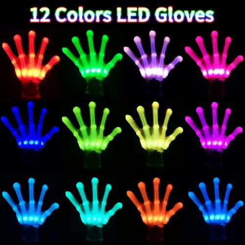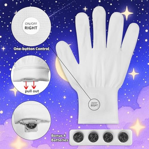 Multi-Scene Use & Size Options for All Ages: Available in multiple sizes to fit kids, teens, and adults, these LED gloves (also called light-up gloves) are perfect for festivals (Halloween, Christmas, Easter) and events (stage shows, birthday parties) — instantly making the wearer the center of attention Multiple Colors, One Click Switching: Multi-color LED light-up gloves with one-click mode control — powered by high-brightness LED beads, all modes can be switched with a single click of the wrist button, making operation effortless for teens and adults alike. A simple wave of your hand creates dreamy light and shadow effects that make these light-up gloves stand out in any setting Soft & Breathable: The light-up gloves are crafted from high-quality nylon and polyester, boasting a soft touch that’s breathable and non-stuffy. They keep hands warm in autumn and winter, while remaining comfortable to wear in spring and summer. With an elastic wrist design, they fit teens’ and adults’ hands perfectly—balancing comfort and stability, non-tight with a sleek, trendy look Ideal Gift: Glowing light-up gloves are perfect for festivals and occasions like Thanksgiving, Christmas, New Year, Easter, and birthdays—a trendy gift for teens and a fun party favor for adults, balancing personality and practicality. They’re also ideal for gifting to friends, treating yourself, or celebrating any occasion Ready-to-Use & Spare Batteries Included: These light-up gloves come pre-installed with 2 CR2016 batteries—pull out the insulation sheet and use right away. They last hours for a full party or show. Bonus 4 spare batteries to keep the fun going. Hidden battery compartment design—easy to replace (no tools needed). Safely sealed circuit—no leakage risk, safe for everyone