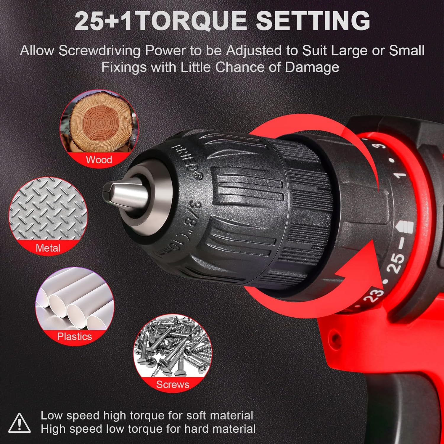 • ⚙️ 【2-Speed Control & 25+1 Torque Settings】 Switch between low speed (0-400 RPM) for precision screwing and high speed (0-1600 RPM) for efficient drilling. The 25+1 torque settings allow you to adjust force according to material hardness—ideal for wood, metal, plastic, and DIY assemblies.