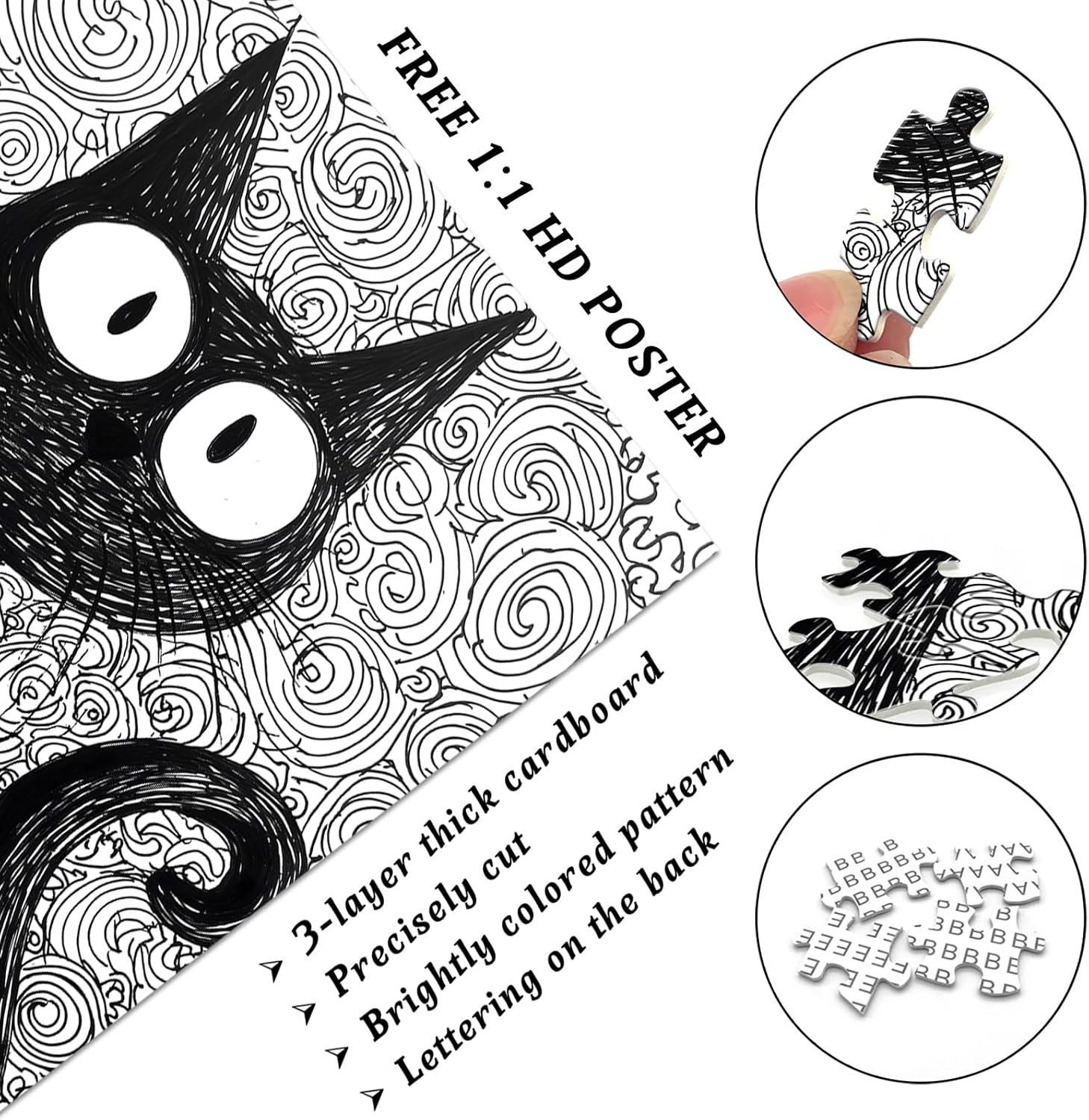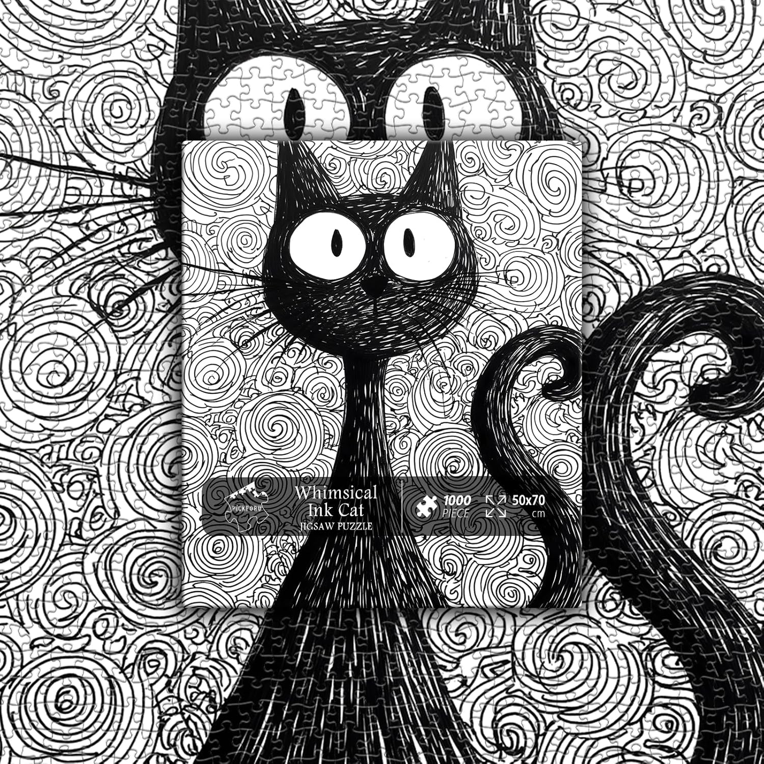 Whimsical Black Cat Artwork:This Black Cat jigsaw puzzle features a playful black cat illustrated in an expressive ink style, surrounded by swirling doodle patterns that create a bold and imaginative artistic design