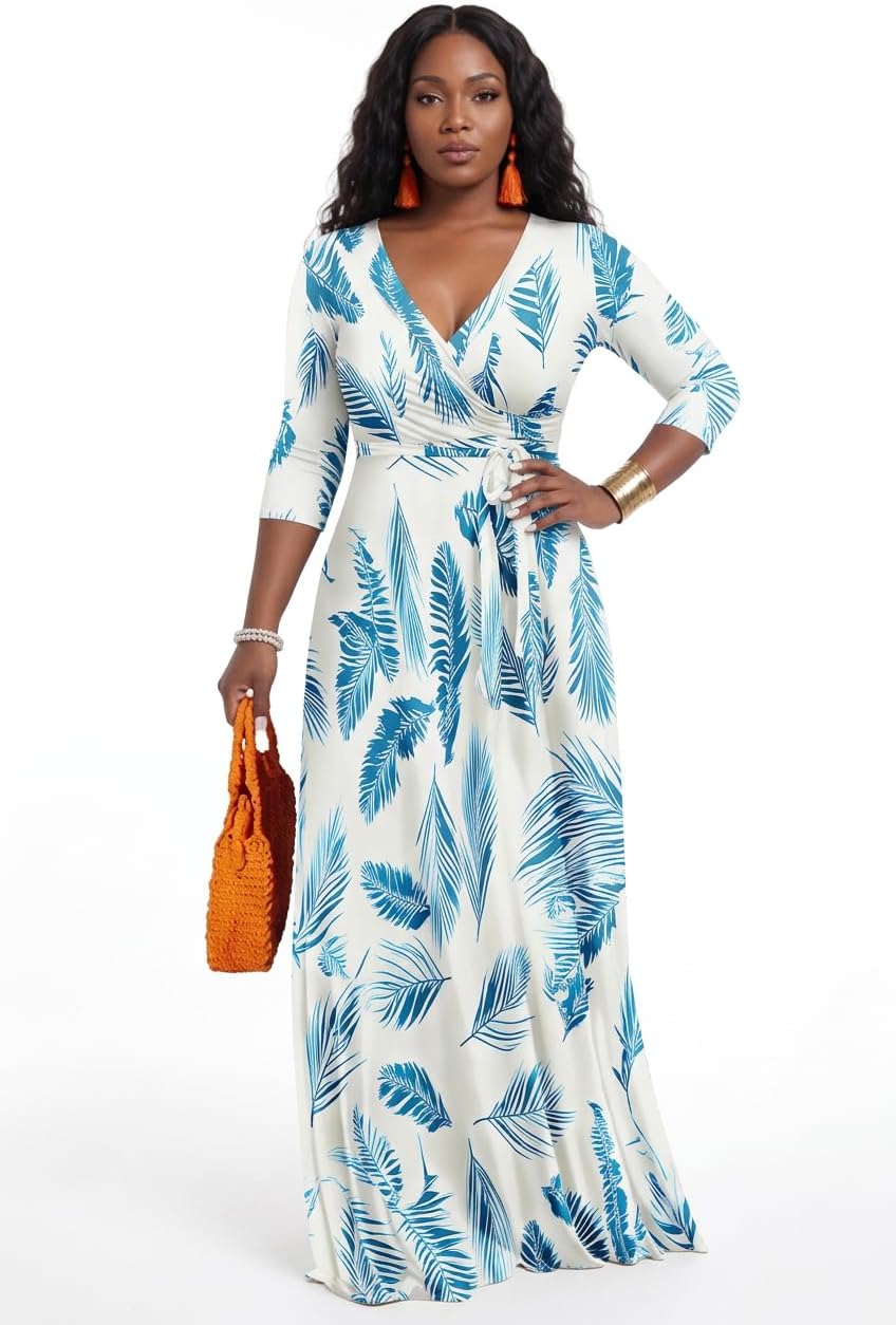 PerZeal Women\u2019s Boho Plus Size V-Neck 3\/4 Sleeve Maxi Dress Colorful Floral Print, Casual Summer Long Dress with Belt
