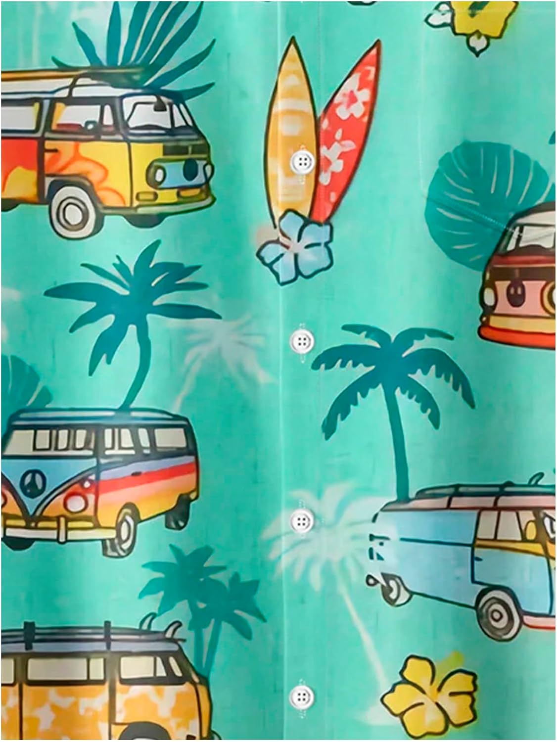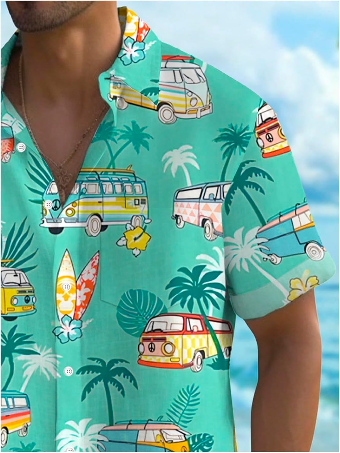 Features: Boho shirt for men features classic collar, short sleeves, bold vacation-inspired print of vintage vans and tropical foliage, and a relaxed fit for a laid-back, playful silhouette