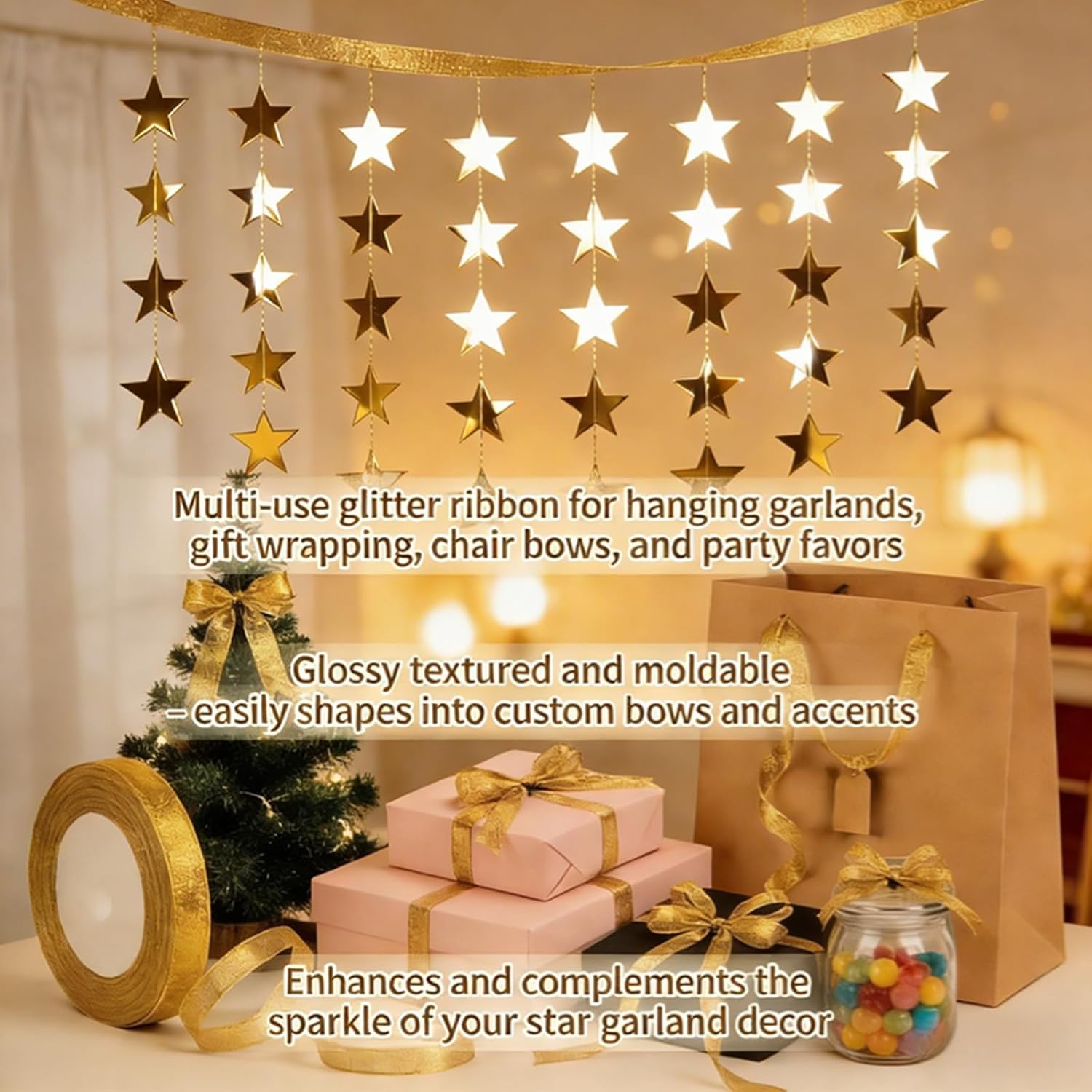 【Tangle-free & Wall-safe: Individually Packed + Ribbon Installation】 Enjoy hassle-free decor from unboxing to hanging. Each star garland strand comes individually packed to avoid shipping tangles and is pre-assembled for immediate use. Use the included 22m gold ribbon by tying it to garland nodes, then hang from door frames, clips or hooks. No glue means no wall damage, making it ideal for renters and delicate walls while working perfectly as star streamers or hanging gold star decorations.
