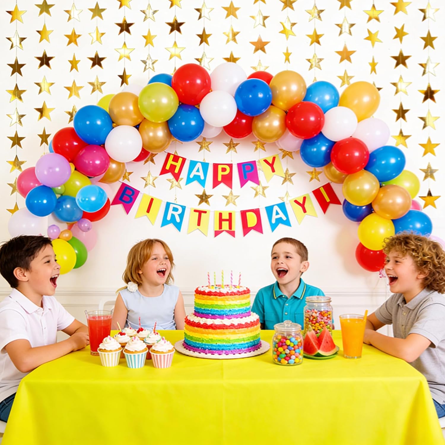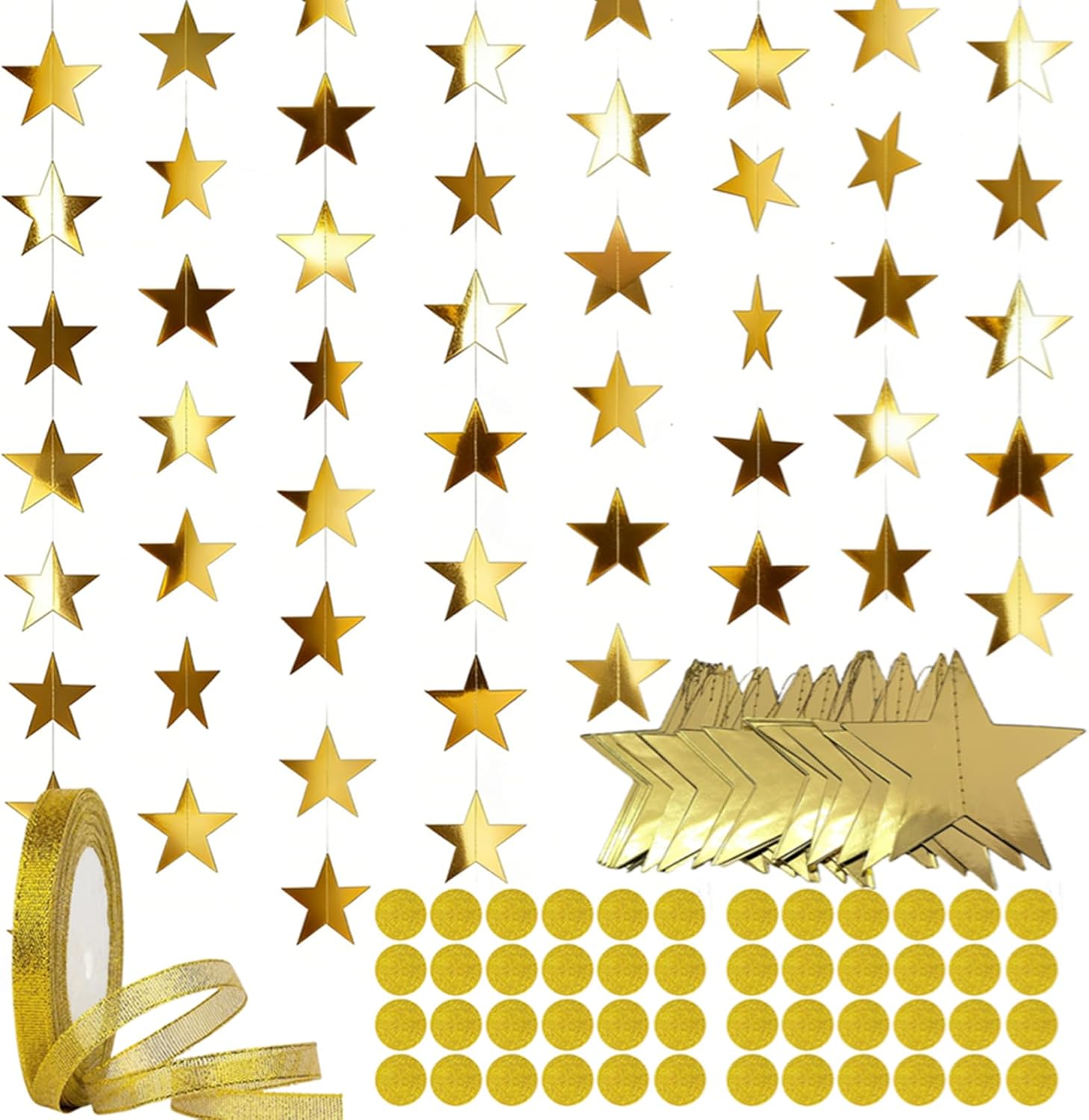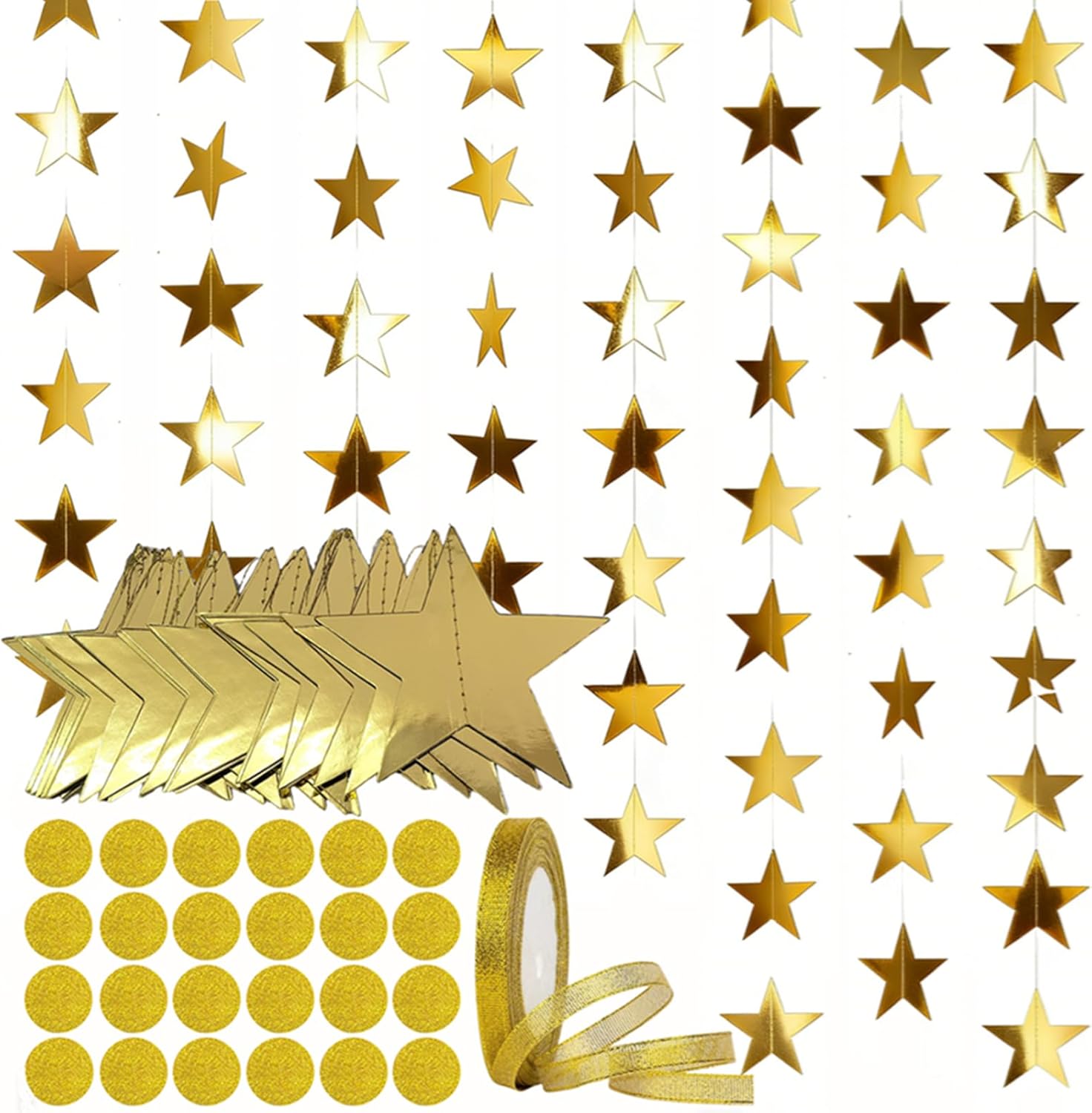 10cm stars, 22m gold ribbon for damage-free installation, and 48pks 2.5CM round sparkle stickers. Crafted from double-sided gold mirror cardstock, it shines brilliantly from every angle, while securely sewn stars prevent falling off. Individually packed to avoid tangles, it’s reusable and easy to store. Perfect for birthdays, Christmas, weddings, graduations, and holiday parties, it doubles as star streamers or statement decor, adding glamorous, cohesive charm to any space.