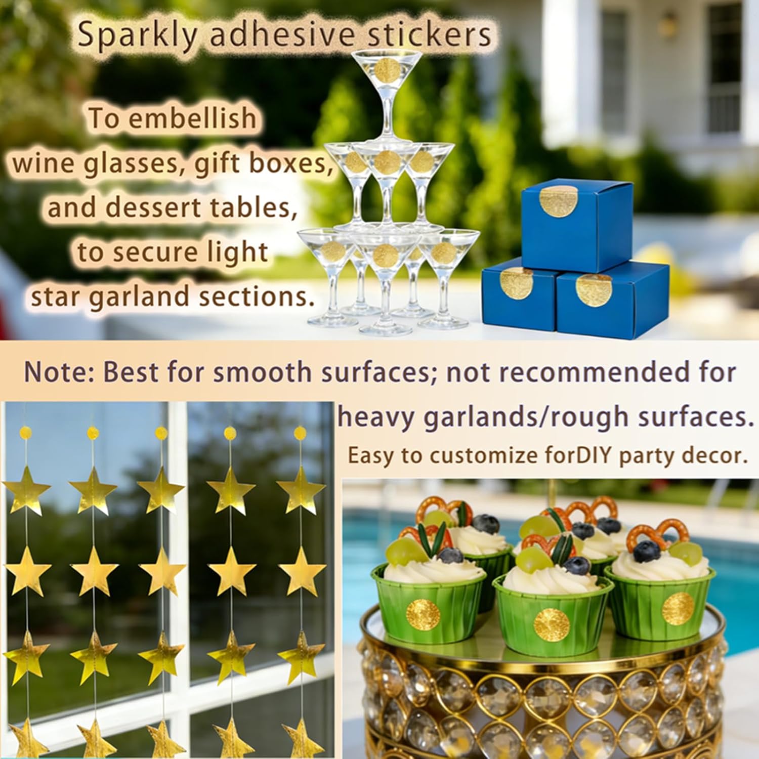【Elevate Decor & Photo Backdrops: 48 Round Sparkle Stickers Included】 Level up your gold party decorations with 2 sheets of round sparkle stickers (48 pks total, 2.5CM each). The shiny design adds extra charm—stick them on walls, gift boxes, cakes or party hats to pair with the garland for a full ""starry vibe."" This set doubles as a stylish photo prop to capture vibrant memories at birthday parties, baby showers and bridal events. It complements your happy birthday banner and star garland decor perfectly for a cohesive look.