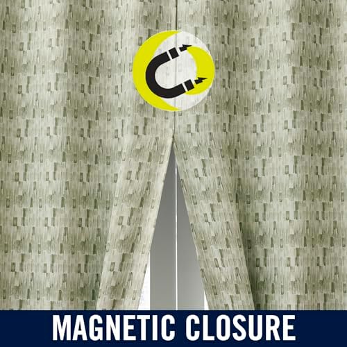 100% Polyester Total Blackout technology with magnetic closure blocks out 100% of outside light while enhancing privacy Energy Efficient design reduces energy lost through your windows by up to 50% Thermal properties help keep summer heat and winter chill out of your home Noise reduction by up to 45% helps you get a sounder, more uninterrupted sleep Built-in grommets fit curtain rods up to 1.5" in diameter Set includes two (2) panels, each measuring 40" wide.