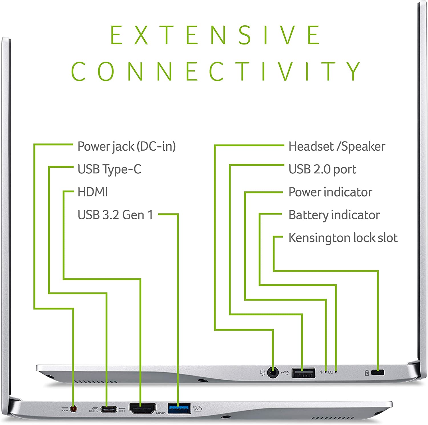 Acer Swift 3 SF314-42-R9YN comes with these high level specs: AMD Ryzen 7 4700U Octa-Core Mobile Processor 2. 0GHz with Precision Boost up to 4. 1GHz (Up to 8MB L3 Cache), Windows 10 Home, 14" Full HD Widescreen IPS LED-backlit Display 1920 x 1080 resolution; 16: 9 aspect ratio, AMD Radeon Graphics, 8GB LPDDR4 Onboard Memory, 512GB PCIe NVMe SSD, DTS Audio, featuring optimized bass response and micro-speaker distortion prevention, Two built-in front facing stereo speakers, Acer Purified. Voice technology with two built-in microphones, Intel Wireless Wi-Fi 6 AX200 802. 11ax Dual-Band 2. 4GHz and 5GHz featuring 2x2 MU-MIMO technology (Max Speed up to 2. 4Gbps), Bluetooth 5. 0, Back-lit Keyboard, Acer Bio-Protection Fingerprint Solution, featuring Computer Protection and Windows Hello Certification, HD Webcam (1280 x 720) supporting Super High Dynamic Range (SHDR), 1 - USB Type-C port USB 3. 2 Gen 2 (up to 10 Gbps) DisplayPort over USB Type-C & USB Charging, 1 - USB 3. 2 Gen 1 port (featuring power-off charging), 1 - USB 2. 0 port, 1 - HDMI port, Lithium-Ion Battery, Up to 11. 5-hours Battery Life, 2. 65 lbs. 1. 2 kg (system unit only) (NX. HSEAA. 003).