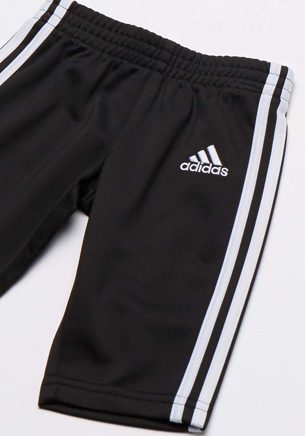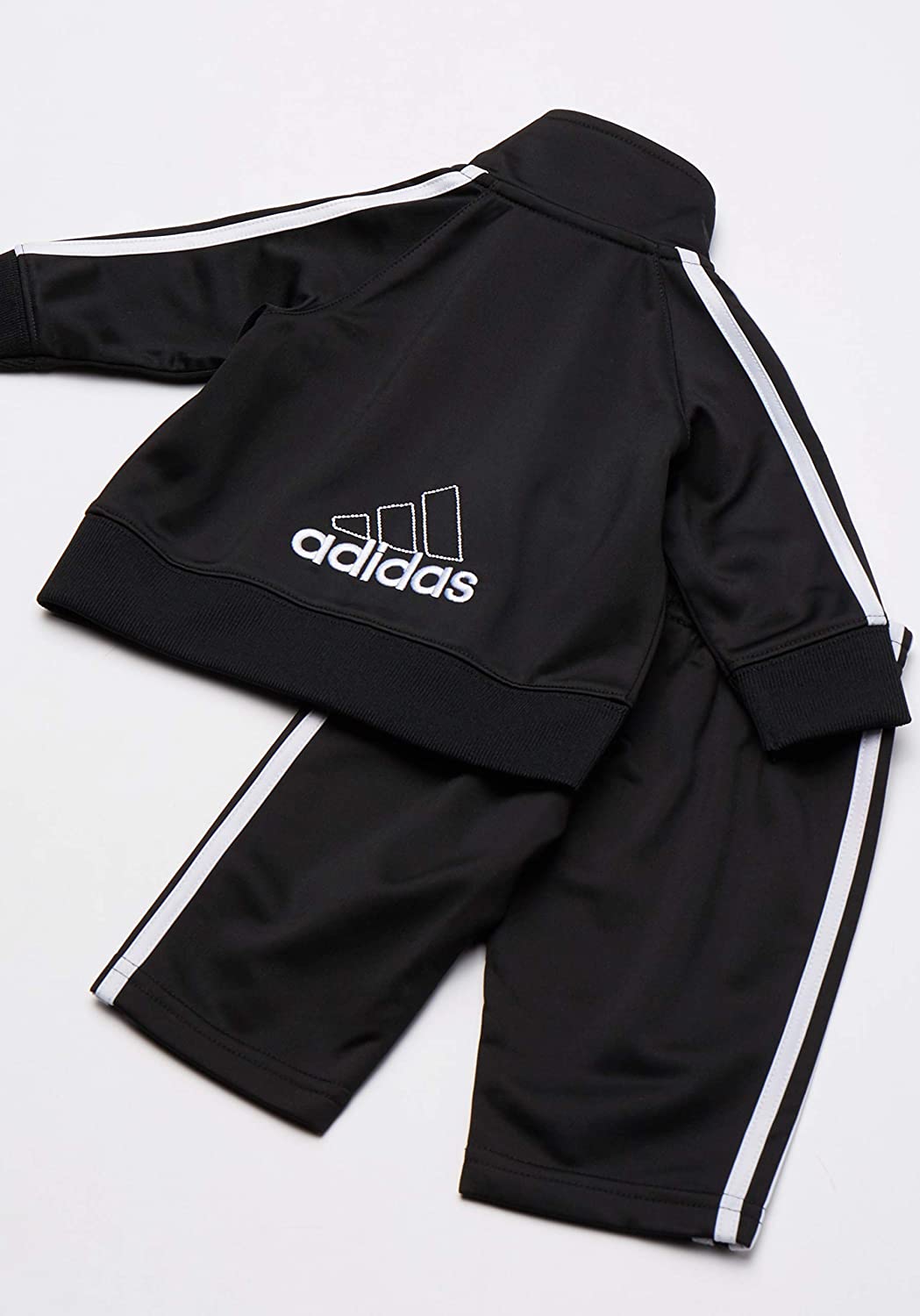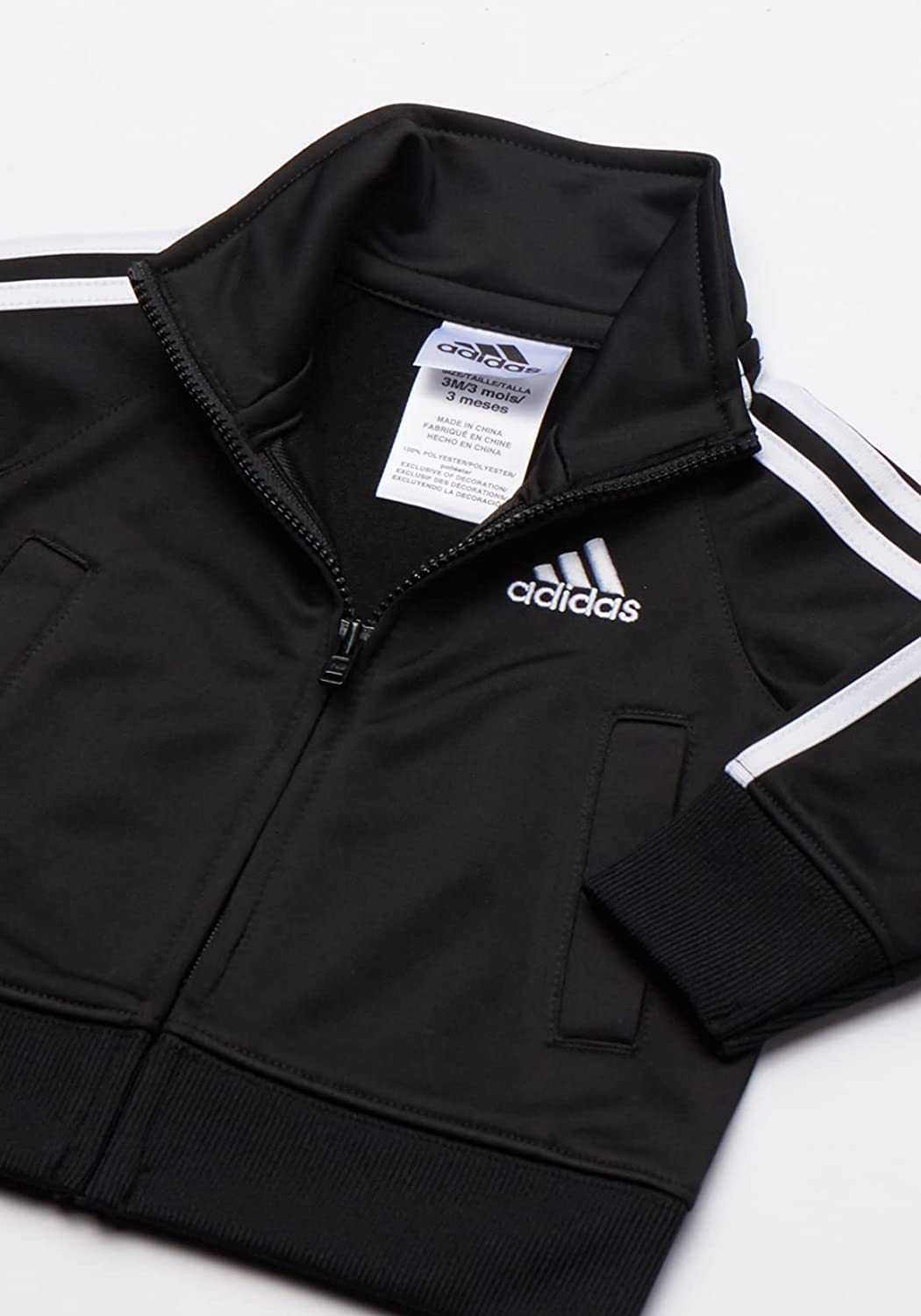 Full zip raglan jacket with dazzle applied stripes. Embroidered Adidas brand mark on left chest. Elastic waist pant with dazzle applied stripes. Embroidered Adidas brand mark. Durable Product.