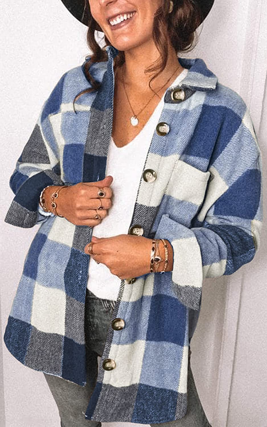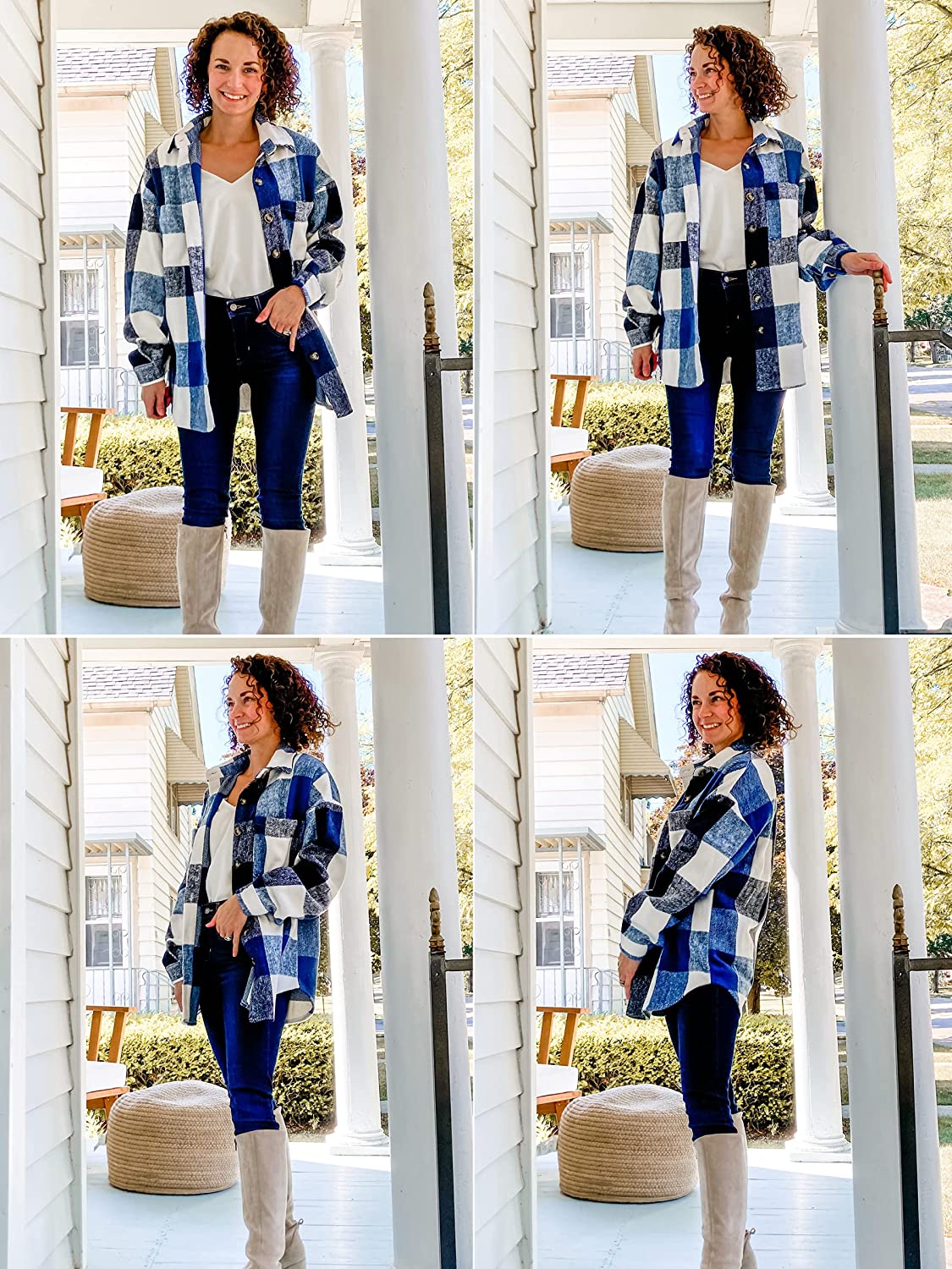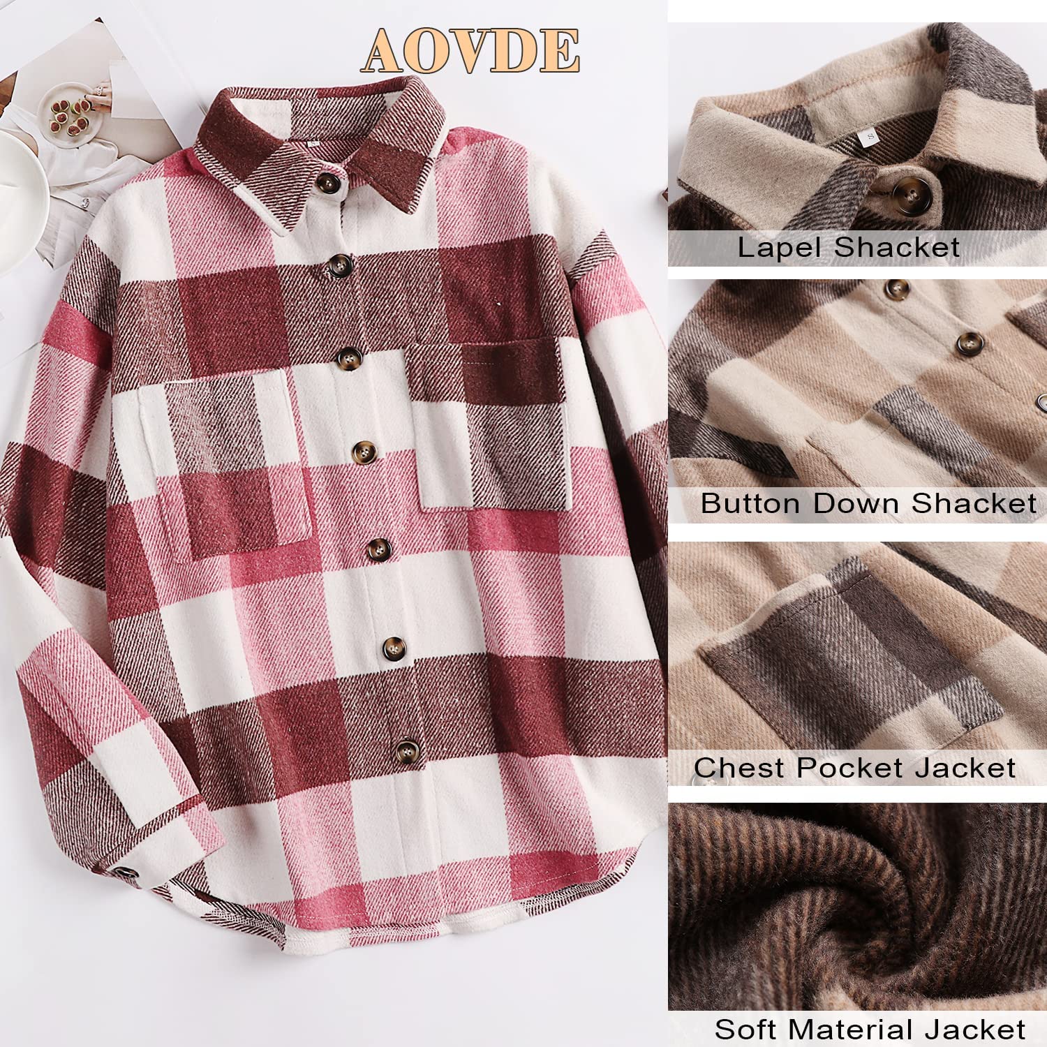 AOVDE Women's Plaid Shirts Flannel Lapel Button Down Long Sleeve Jacket Casual Boyfriend Shacket Jacket Coats