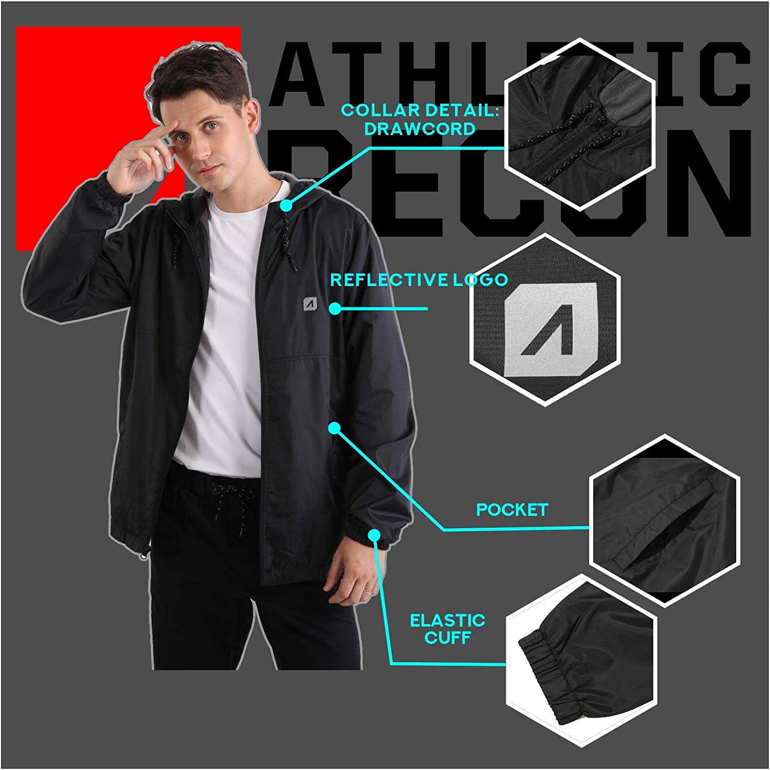 ARECON Men’s Windbreakers Waterproof Windproof Lightweight Jacket for Hoodie Full Zip Breathable Outdoor Running Rain Coat