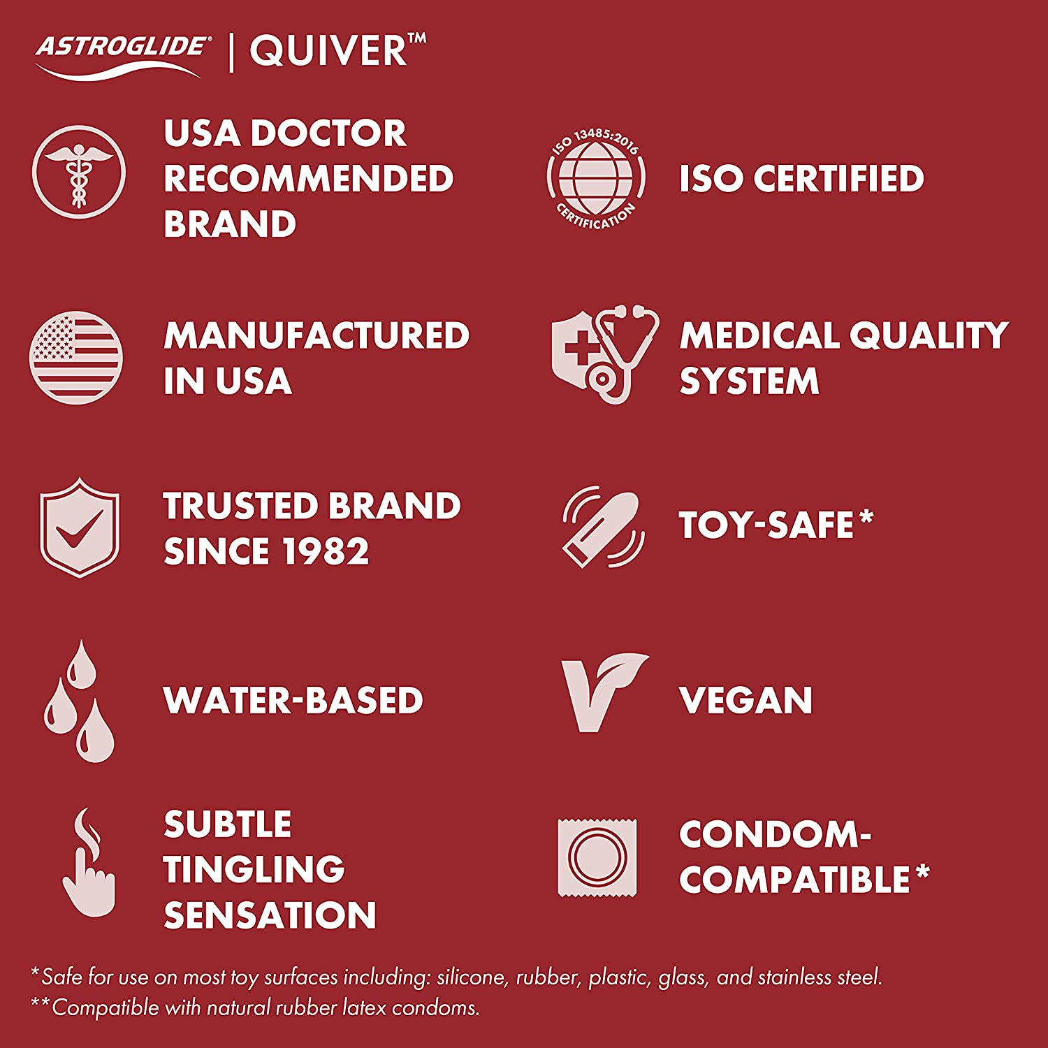 Add some playful and pleasing tingling sensations to your most sensitive areas. This silky-smooth lubricant elevates those sensual moments leaving you glowing and quivering inside and out. Subtle yet satisfying, QUIVER™ provides just a touch of extra playful sensation and magic to take your sexual pleasure up a notch. ASTROGLIDE QUIVER™ is a water-based lube, so it cleans up easily and is great for couples, solo, and use with sex toys. Reduce friction and irritation while adding pleasure and excitement to your intimate playtime. This water-based personal lubricant is also compatible with natural rubber latex condoms.