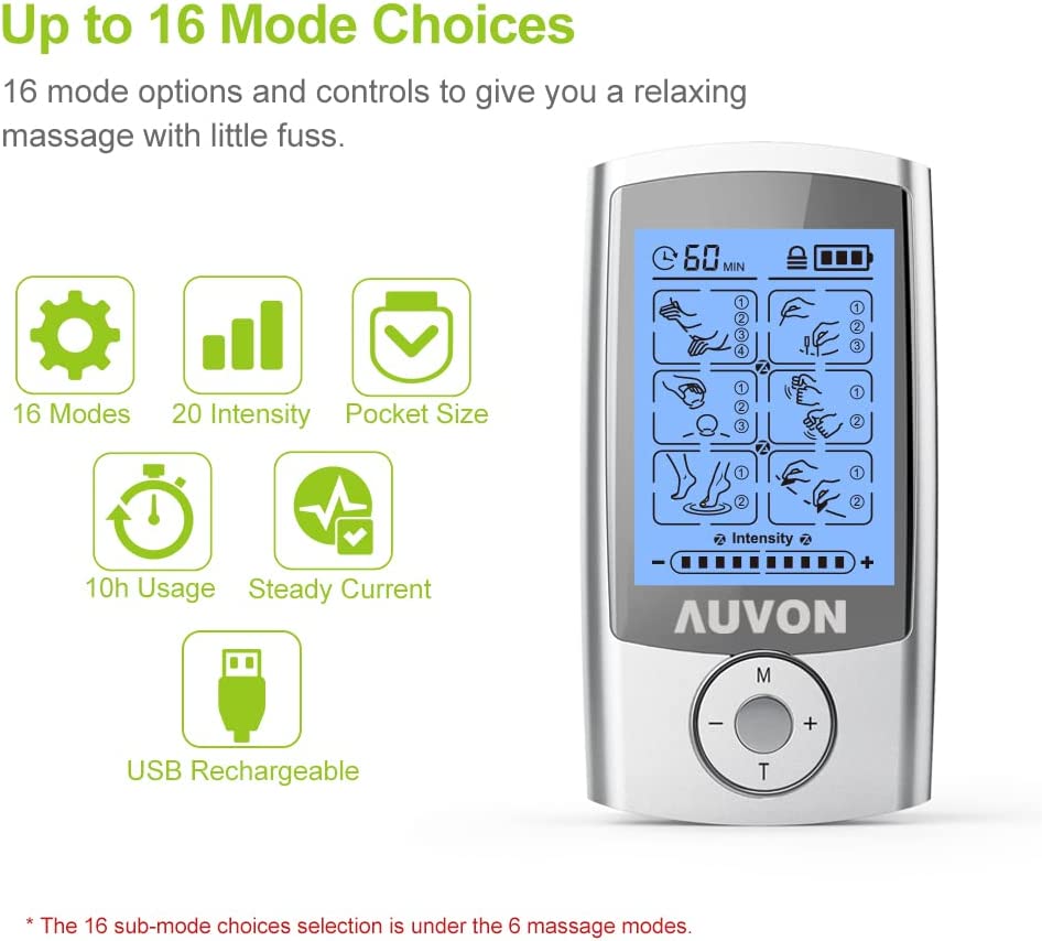 AUVON Rechargeable TENS Unit Muscle Stimulator, 16 Modes 4th Gen TENS Machine with 8pcs 2"x2" Premium Electrode Pads for Pain Relief