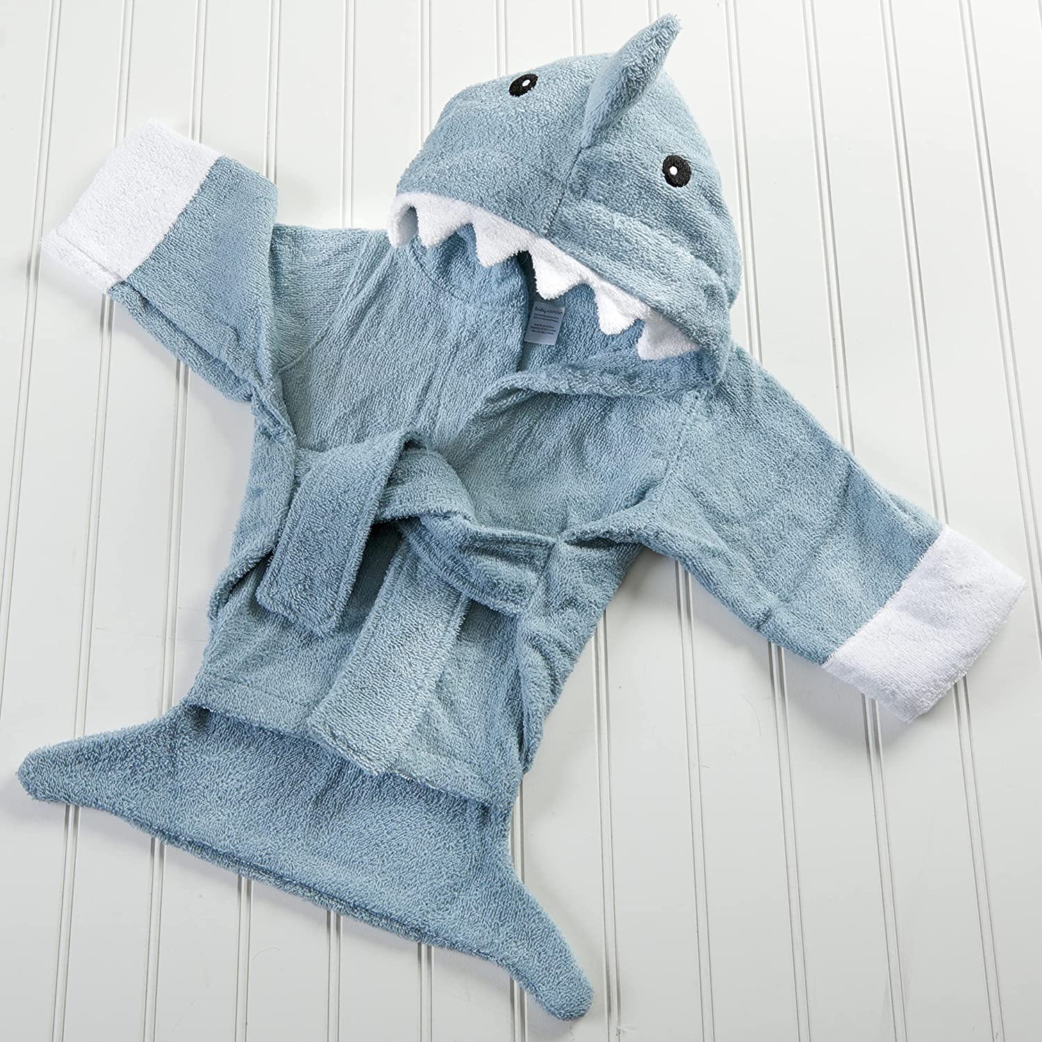 Features and facts: ""Let the Fin Begin"" Terry Shark Robe blue terry robe with white cuffs, two terry ties in front, a hood with smiling, white shark's teeth, appliqued black eyes and a dorsal fin accent. Sharks Machine-wash and dry (low). Size 0-9 months.