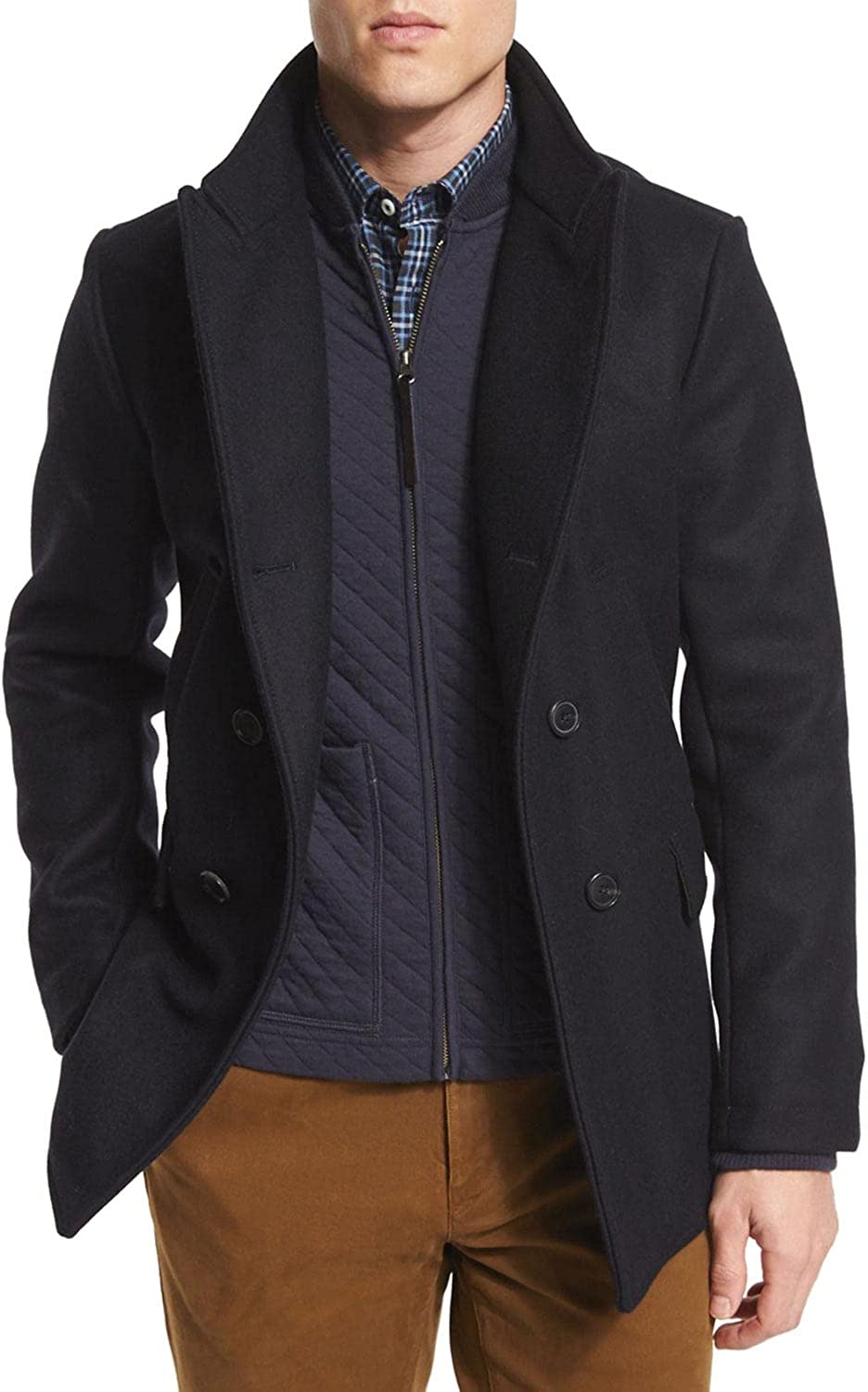 Billy Reid Men's Wool Double Breasted Bond Peacoat with Leather Details