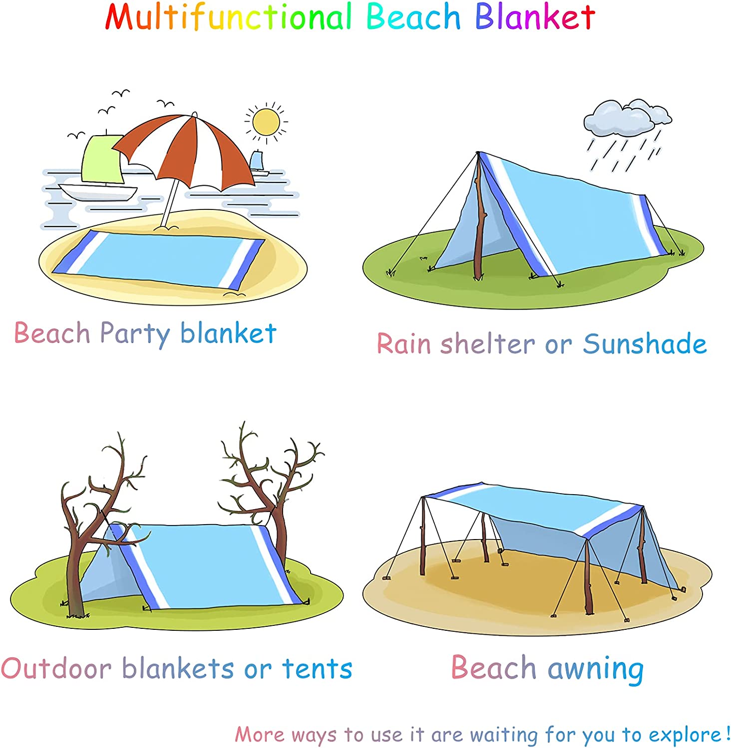 BYDOLL Beach Blanket 78''×81'' 4-7 Adults Oversized Lightweight Waterproof Sandproof Beach Blanket Large Picnic Mat Beach Blanket for Beach Travel Camping Hiking Picnic(78" X 81", Blue-Mixed)