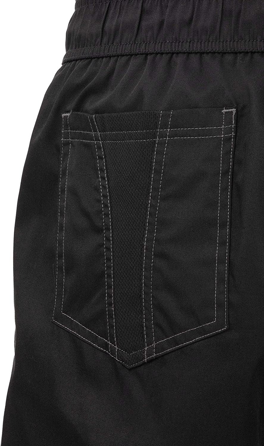 4.6 oz. 65/35 poly/cotton 'lite' twill fabric with Cool Vent inserts on side seam and back of knee, double-needle stitching, curved elastic waistband with drawstring, zipper fly, 2 slanted side pockets and 2 back pockets with CV detail.