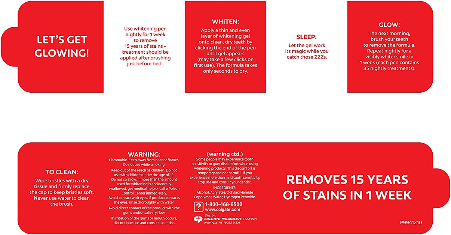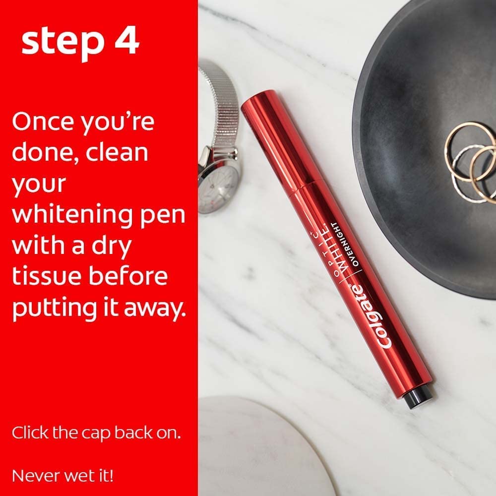 Whiten teeth while you sleep. In as little as a week (two weeks of treatment is recommended for best results), these Optic White teeth whitening pens whiten your teeth up to two shades and have 15X more whitening power in 1 treatment versus brushing alone, unlike other tooth whitening pens. The whitening pen pack includes one tooth whitener pen and one overnight stand for easy storage next to the sink or countertop. Gentle Whitening: We know teeth whitening sensitive teeth can be a pain. That's why our enamel safe tooth whitening gel formula has been designed for no sensitive teeth during and after the whitening process. Easy to Use: Click the back of the pen to dispense the unique formula to clean, dry teeth. The teeth stain remover formula dries quickly and whitens your teeth overnight. To remove, simply brush your teeth when you wake up to white teeth.