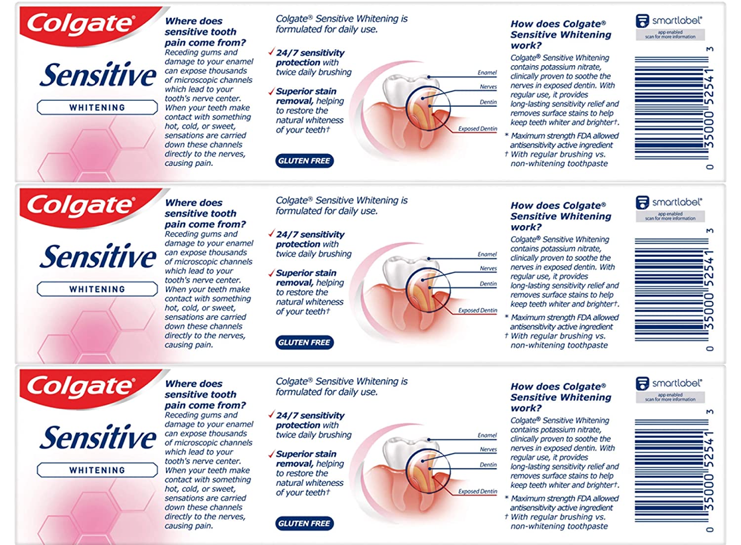 Colgate Sensitive Whitening toothpaste provides 24/7 sensitivity protection with twice-daily brushing. This sensitive teeth toothpaste contains potassium nitrate, clinically proven to soothe the nerves in exposed dentin. With regular use, it provides long-lasting sensitivity relief and removes surface stains to help keep teeth whiter and brighter (with regular brushing vs. non-whitening toothpaste). Plus, Colgate Sensitive Whitening toothpaste helps repair weakened enamel, protect teeth from cavities and provides the freshness you trust from Colgate.