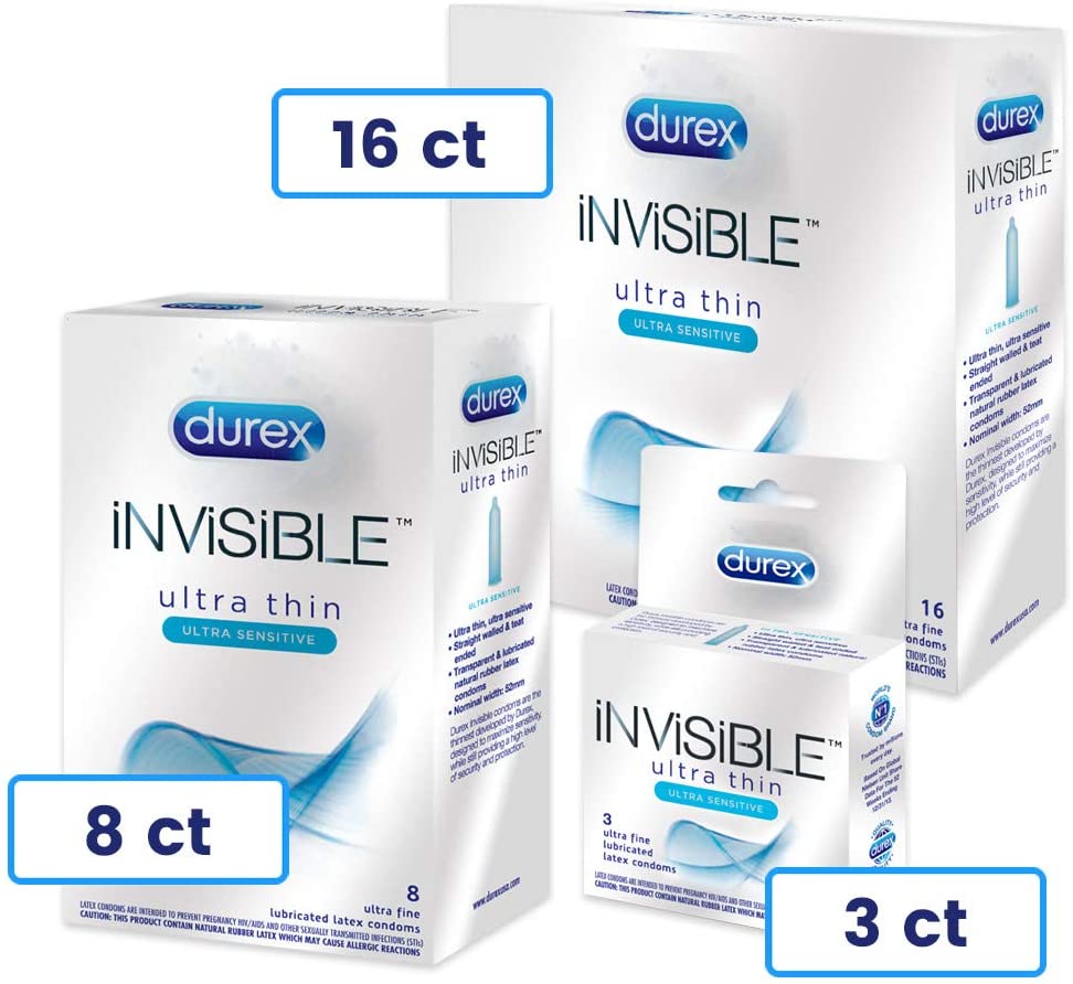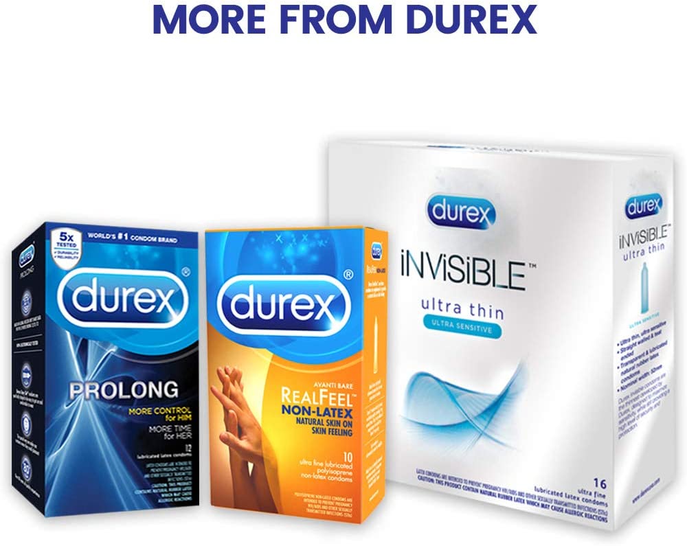 Durex Invisible Ultra Thin Ultra Sensitive Lubricated Latex Condoms add excitement while still providing a high level of protection. Each condom is extra thin for extra sensitivity. With its fitted shape, the Invisible condom is designed to be easy to put on and comfortable to wear. It is teat ended and lubricated. Unlike some latex condoms, Invisible condoms are manufactured in a way that produces a more pleasant scent. This means you won't have to worry about unpleasant distractions and instead can relax and enjoy every moment with your partner. Invisible condoms are the thinnest condom developed by Durex, designed to maximize sensitivity, while still providing a high level of security and protection. All Durex condoms are safe to use for five years from the date manufactured, depending on environmental conditions. With this pack of Durex condoms, you'll always be prepared. description