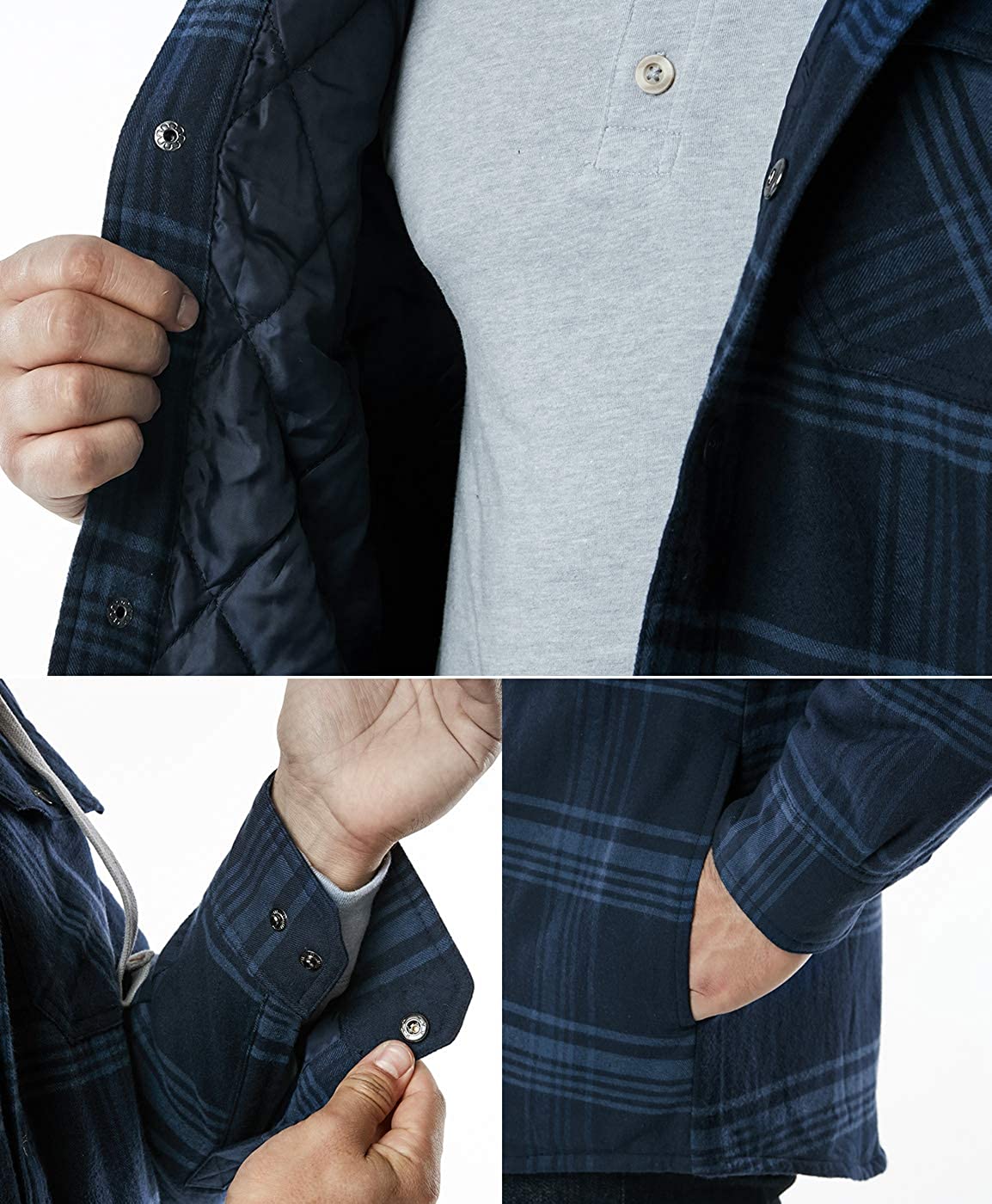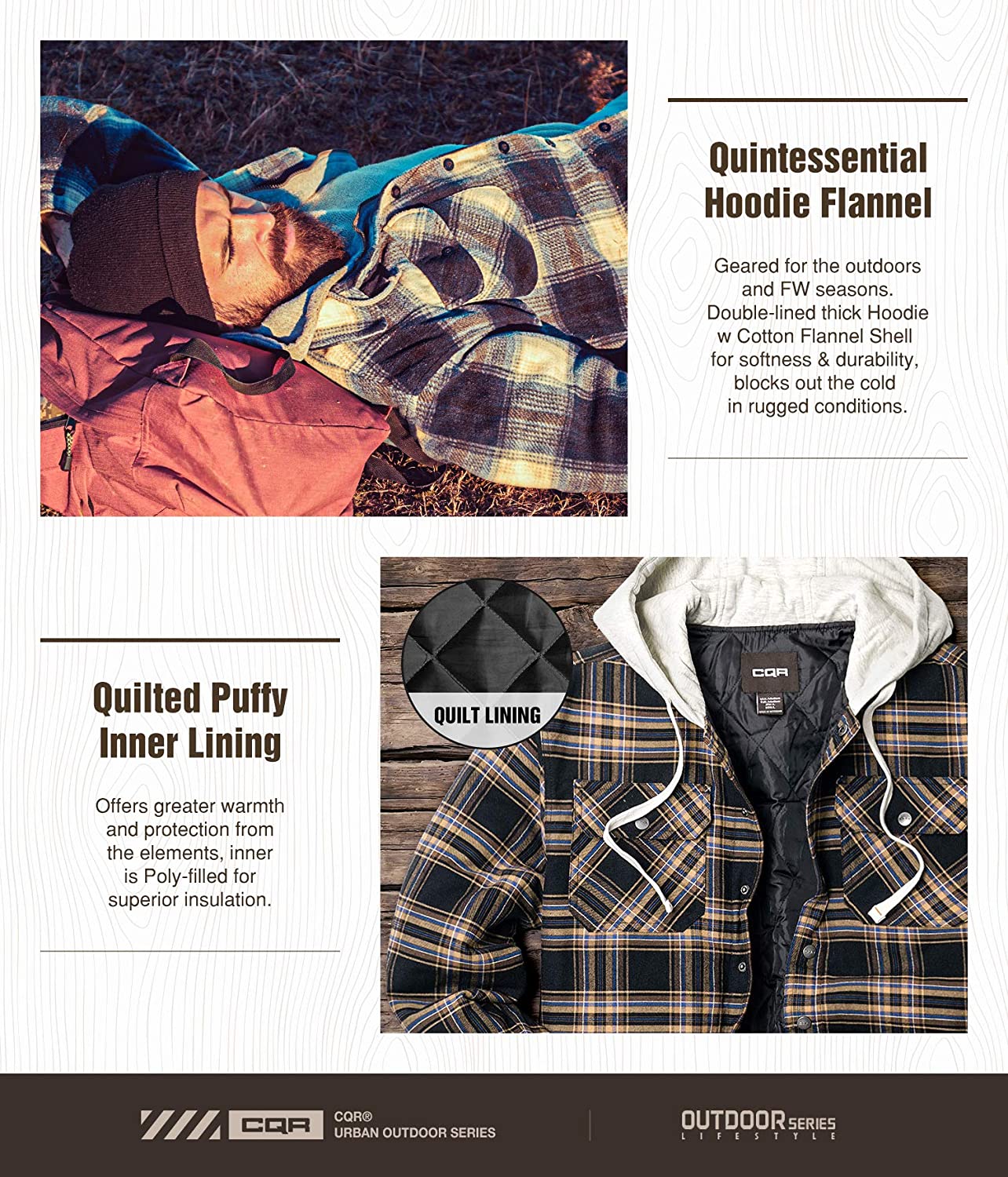 CQR Men's Hooded Quilted Lined Flannel Shirt Jacket, Long Sleeve Plaid Button Up Jackets