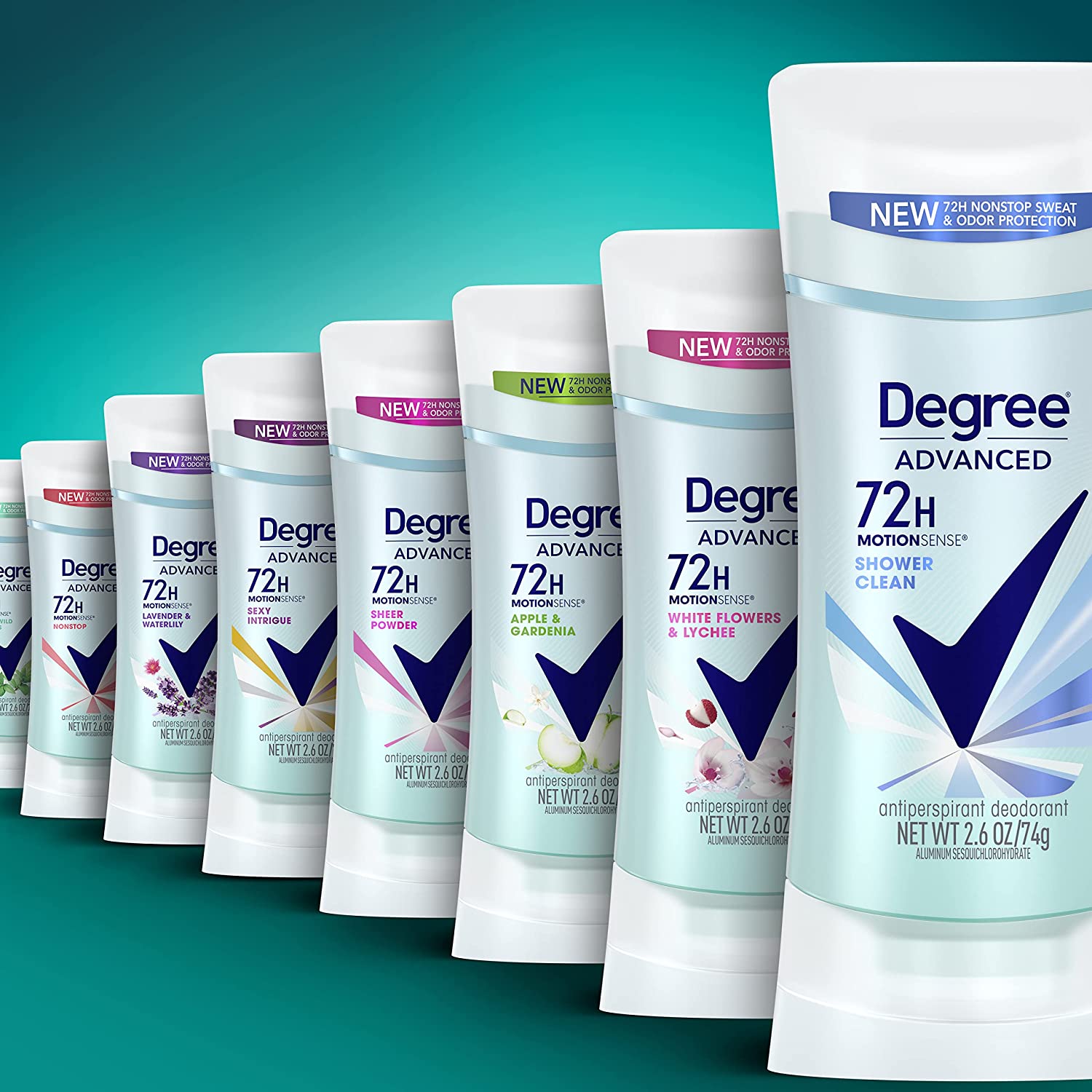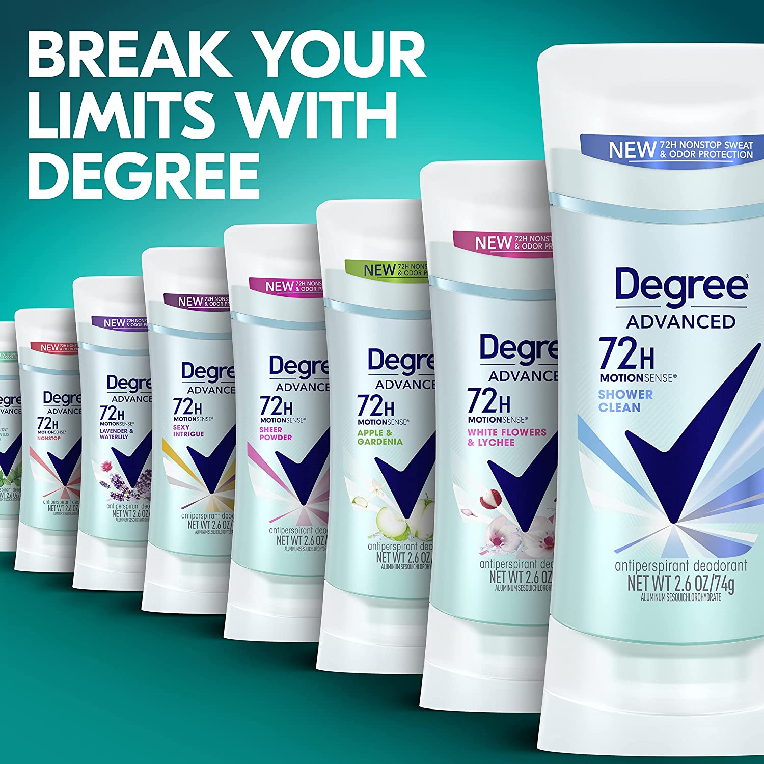 Degree is upgrading to our best formula yet. Our new and improved formulation gives you 72 hours of nonstop sweat and odor protection. You will still find all the same fragrances you know and love, but now with our new and improved long lasting protection! For a limited time, you may still receive our old 48-hour formulation while all our new 72-hour products make their way to a store near you. Degree Advanced Shower Clean Antiperspirant Deodorant delivers nonstop protection, so you can face the day with confidence. This antiperspirant for women features 72-hour sweat and odor protection and the bright floral scent of rose and jasmine, blended with delicate fruit for an invigorating, clean feeling. Only Degree has MotionSense technology that moves in sync with your body. This antiperspirant deodorant spray releases a burst of subtle fragrance every time you move, for nonstop protection. Degree Advanced Shower Clean Antiperspirant Deodorant keeps you feeling fresher, drier, and more confident. This powerful antiperspirant deodorant responds when you need it most so that you don't have to worry about slowing down. Simply swipe and start moving.