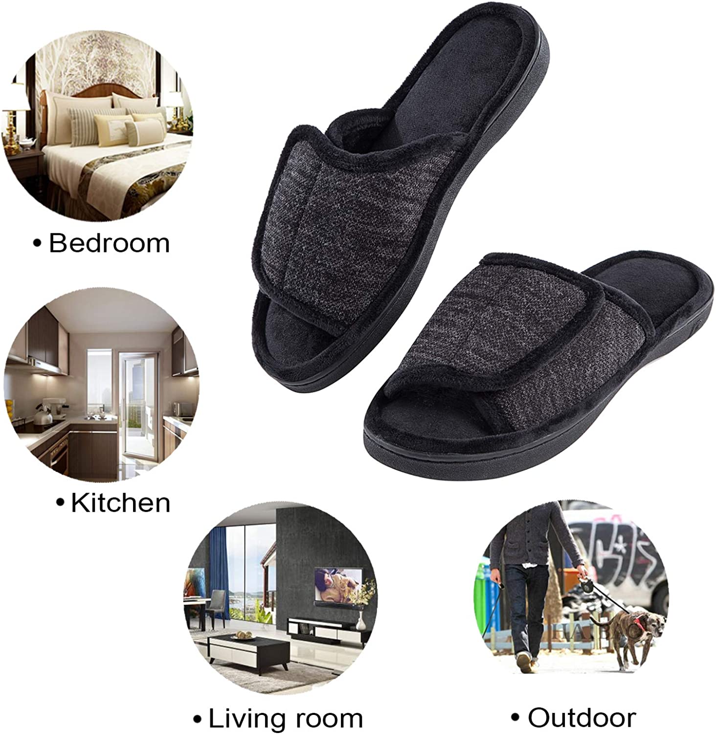 DL Adjustable Mens Slippers Memory Foam, Open Toe House Slippers for Men Comfy Indoor Outdoor, Cozy Breathable Slide Bedroom Velcor Slippers Size 7-14 Black Gray Navy Brown