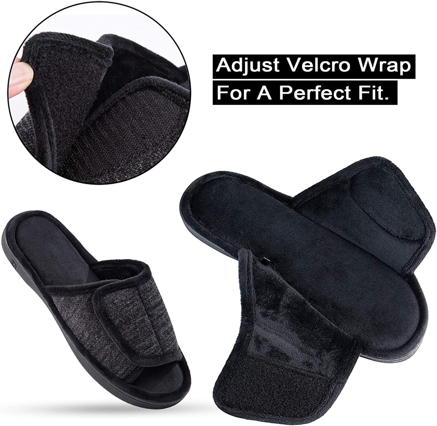 DL Adjustable Mens Slippers Memory Foam, Open Toe House Slippers for Men Comfy Indoor Outdoor, Cozy Breathable Slide Bedroom Velcor Slippers Size 7-14 Black Gray Navy Brown