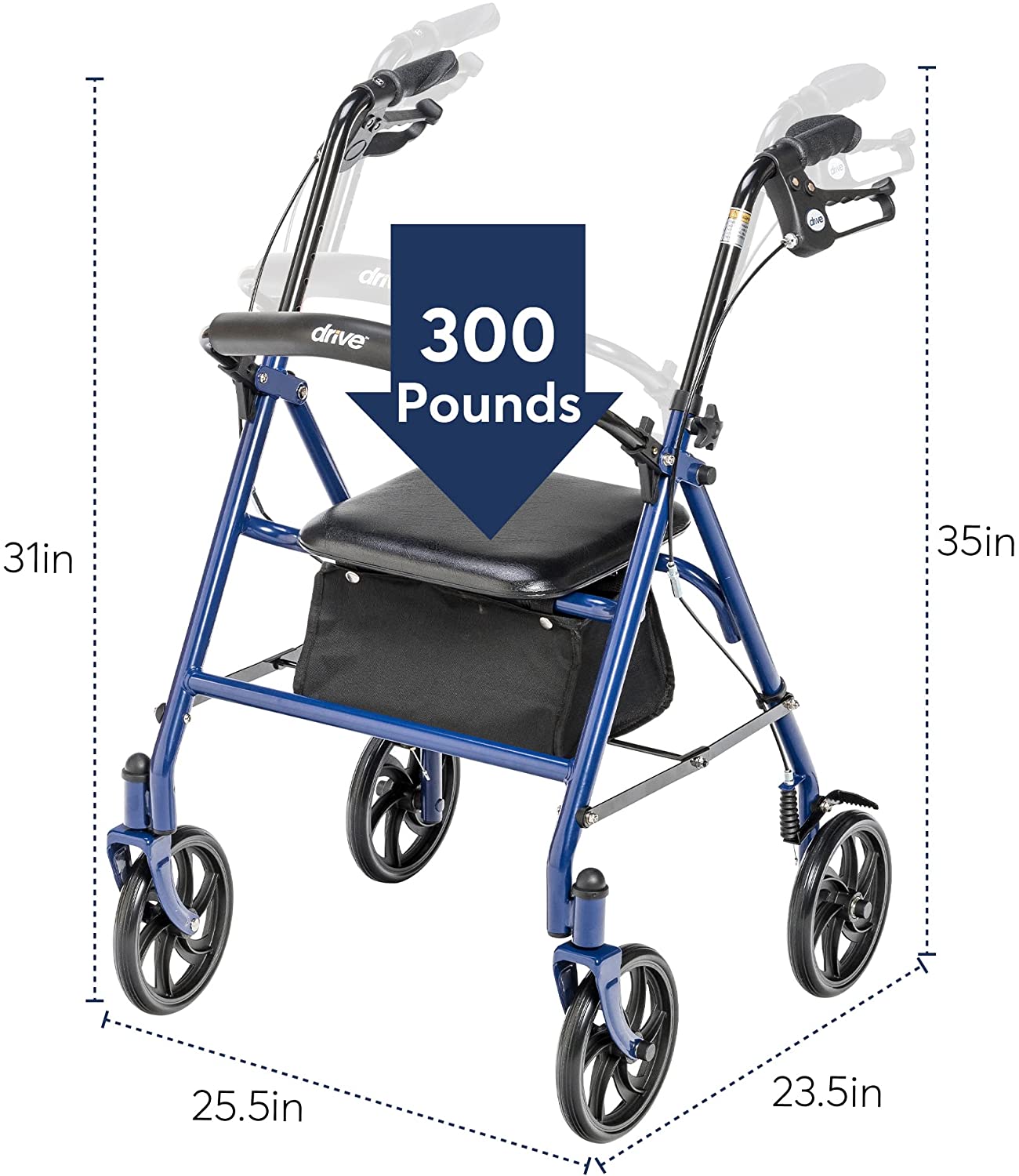 Drive Medical's portable rollator walker with seat continues to lead the charge when it comes to design, quality, and value. With a strong and steady steel frame, this 4-wheeled adult walker offers strength, support, durability, and comfort. The walker with seat and wheels comes complete with a hinged padded backrest, which can be removed by folding it up or down. The indoor and outdoor walker also boasts comfortable 12-inch square seat, a convenient pouch for personal items, and 7.5-inch wheel casters. The height-adjustable rollator's handles can moved up or down according to your height and are ergonomic to reduce undue stress on hands and joints. With the 4-wheel rollator walker as your travel companion, there is no need to overextend yourself because this standing walker doubles as a comfortable chair, allowing you to rest and refresh yourself anywhere and at any time. Backed by a limited lifetime warranty from Drive Medical, a leading brand of mobility aids and other medical goods for more than 20 years, you can purchase with confidence.