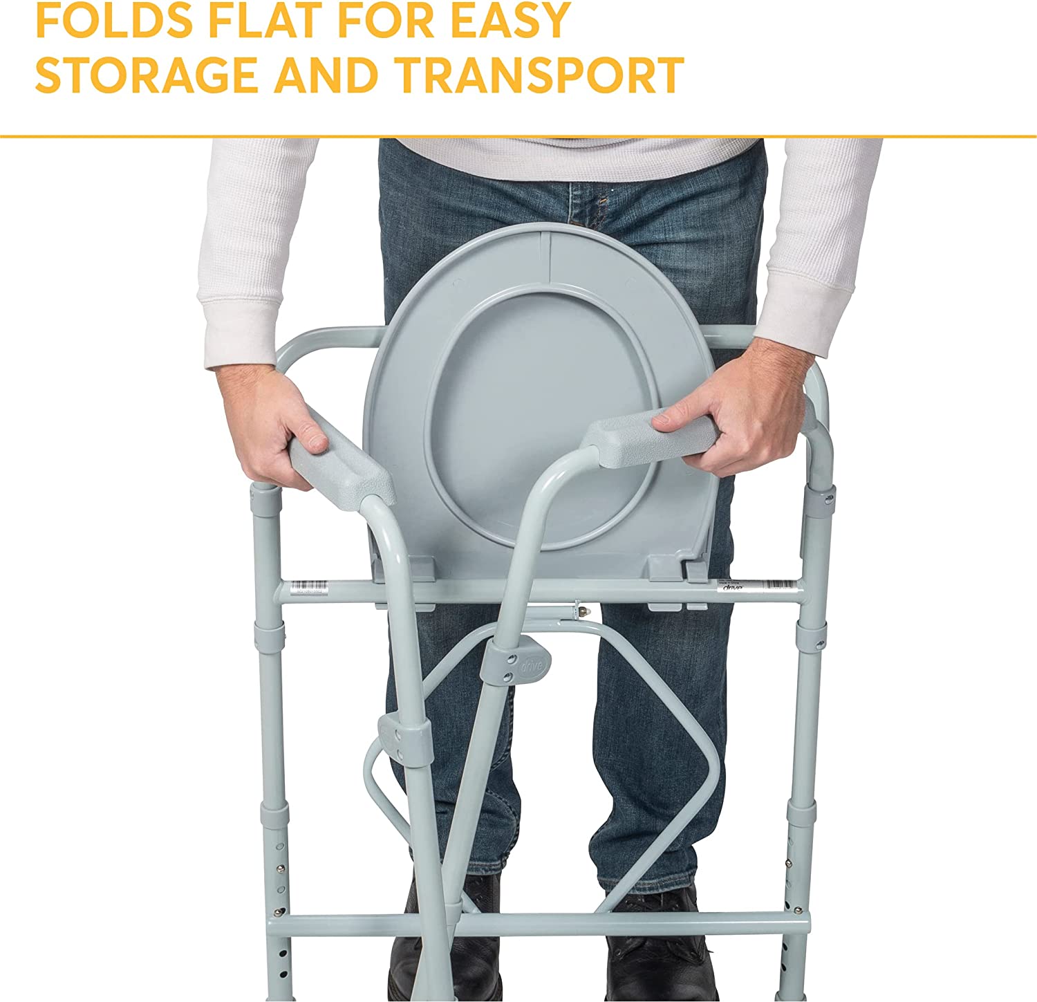 The Drive Medical folding toilet chair can be used as a bedside commode for elderly, individuals recovering from surgery or disabled individuals, or as a commode chair for toilet with arms, or a toilet safety frame. A durable plastic snap-on seat and grey powder-coated lid, featuring steel welded construction, increase the strength and durability of this toilet chair. For added comfort and safety, plastic arms, a 7.5-qt. commode bucket with a carry handle, cover, and splash shield are also included. Backed by a limited lifetime warranty from Drive Medical, a leading brand of bath safety products, mobility aids, and other medical goods for more than 20 years, you can purchase with confidence.