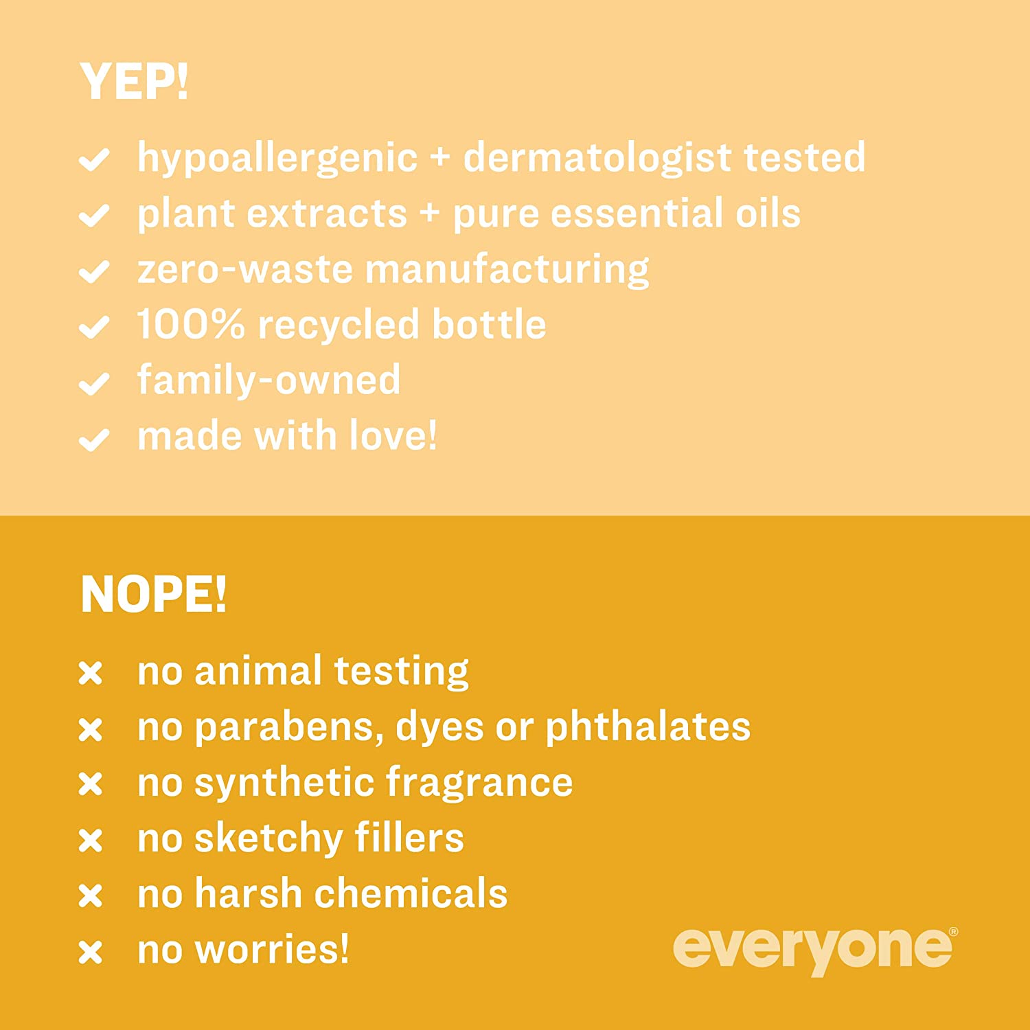 This is not your average soap. Everyone 3 in 1 Soaps combine gentle coconut cleansers, organic plant extracts, and vitamins E and B5 to nourish skin and hair while cleansing it of the day’s dirt and impurities. We know life gets crazy, that’s why our convenient 3-in-1 soaps work great as a shampoo, body wash, bubble bath, and even shave gel for a simplified routine. Plus, less bottles mean less plastic. At EO Products, we believe the best resources come from nature. That is why we are committed to our zero-waste mission. Our products are always made with reduction and repurposing in mind, this includes our recyclable packaging. Since 1995, we've made our products from domestic and imported ingredients in our family-owned and -operated factory in San Rafael, California. We learned early on that the only way to meet our own high standards was to take responsibility for everything ourselves. From our family to yours, enjoy.