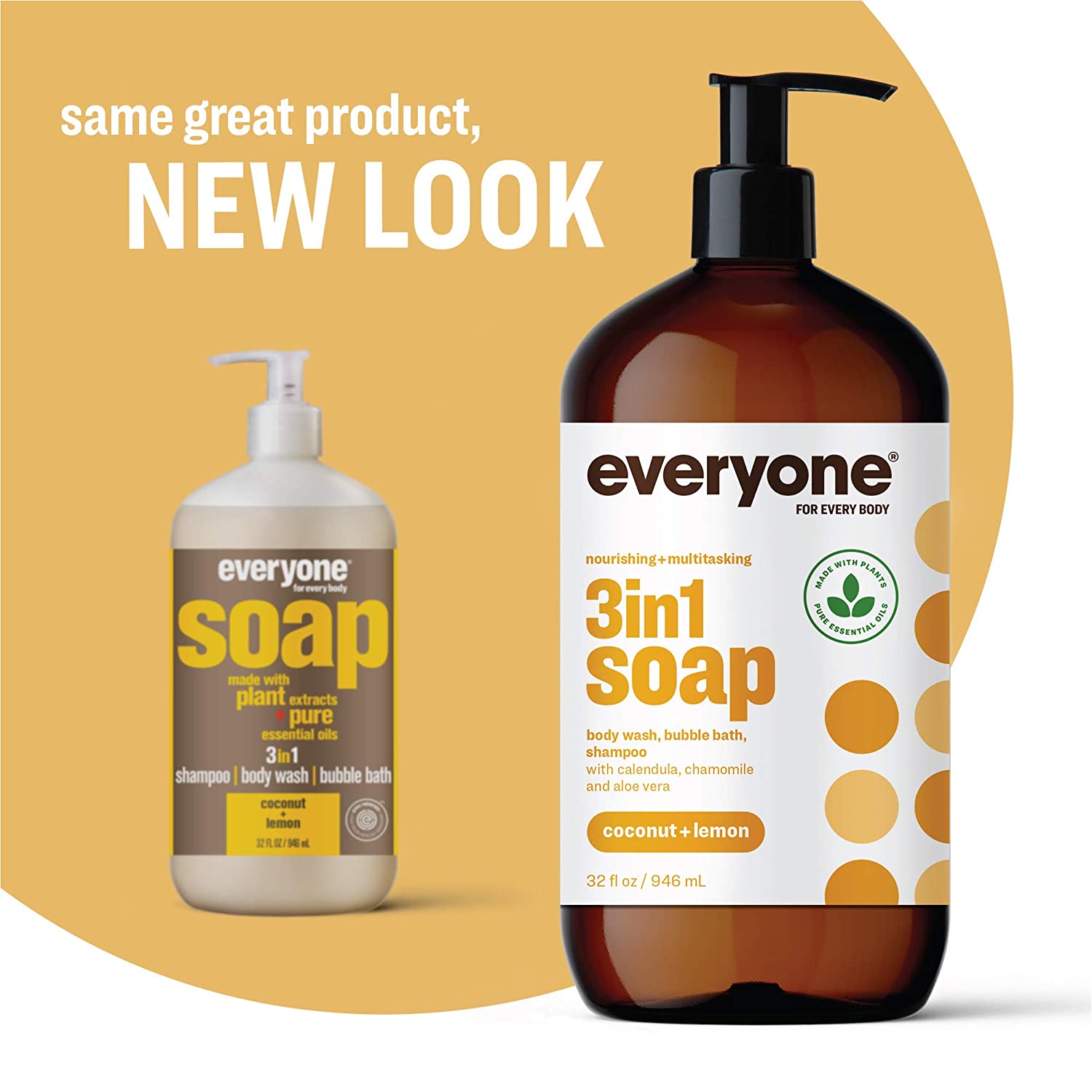 Everyone 3-in-1 Soap, Body Wash, Bubble Bath, Shampoo, 32 Ounce (Pack of 2), Coconut and Lemon, Coconut Cleanser with Organic Plant Extracts and Pure Essential Oils (Packaging May Vary)