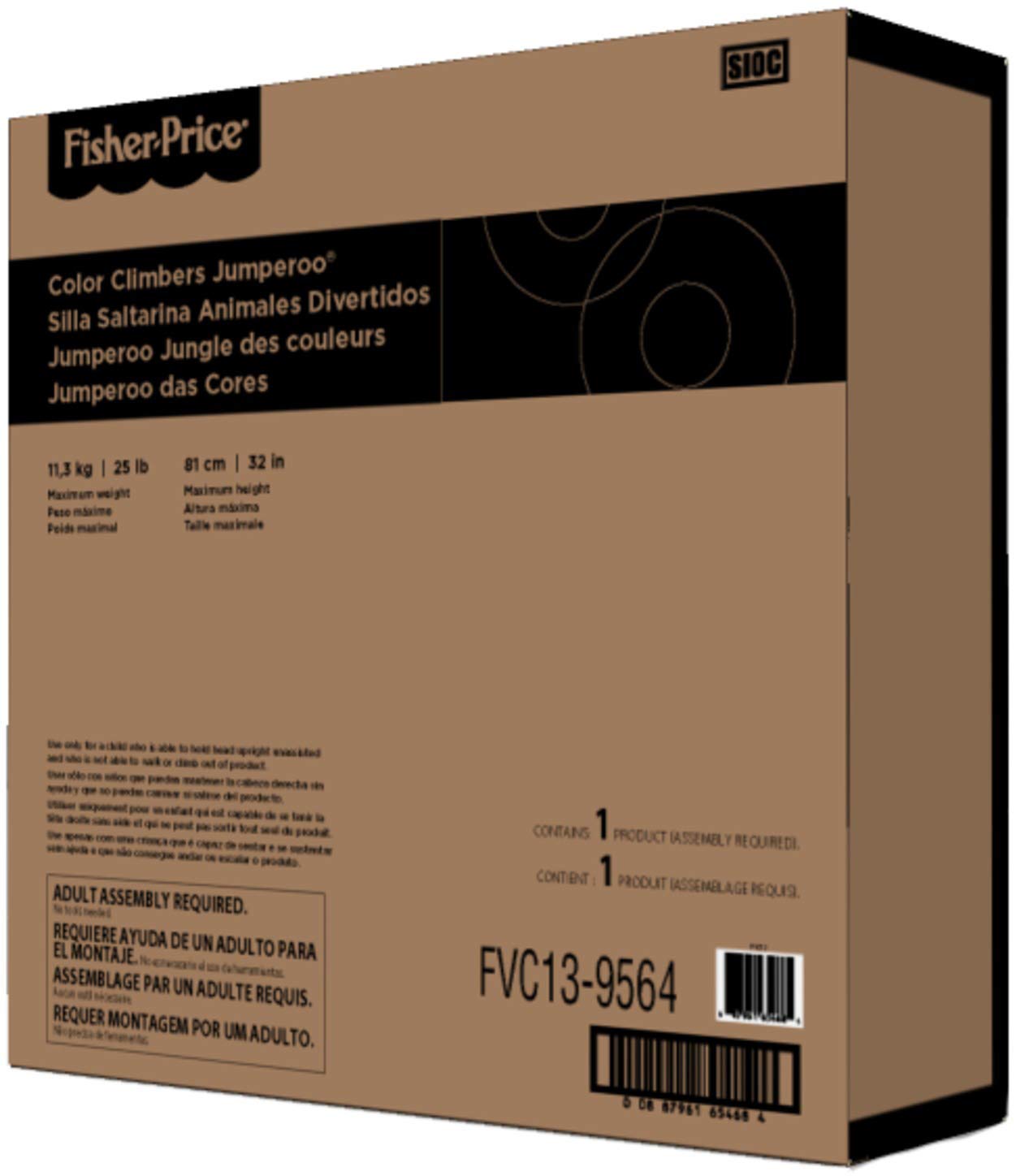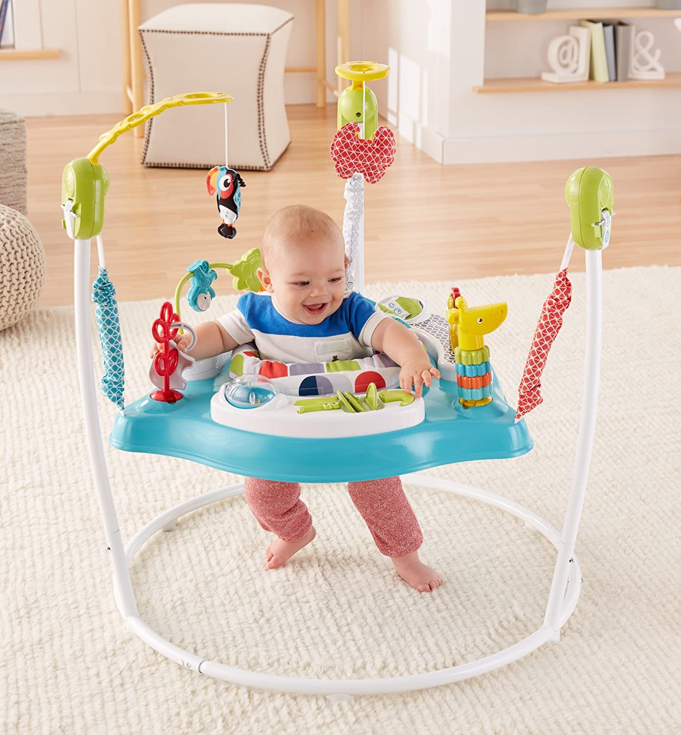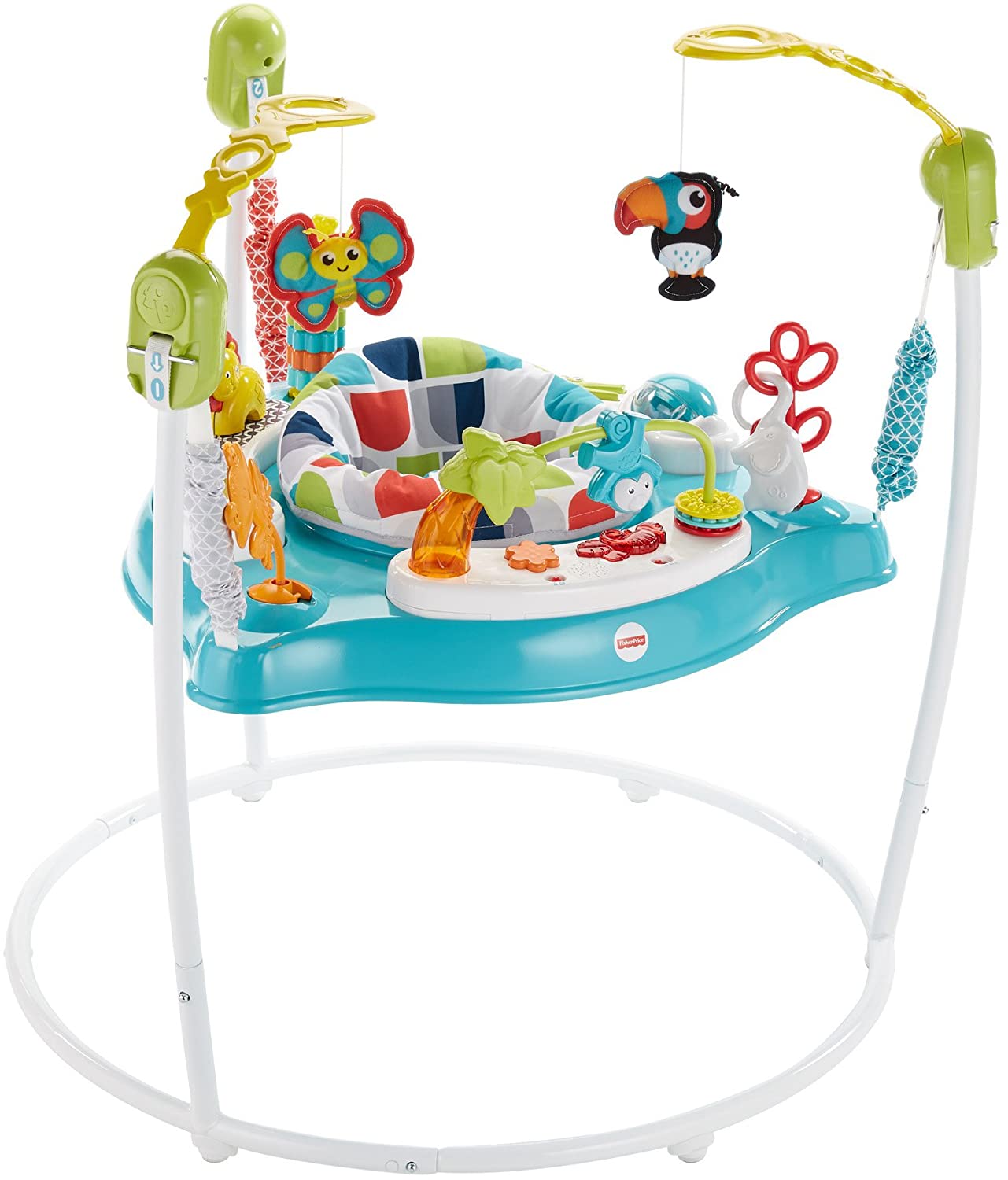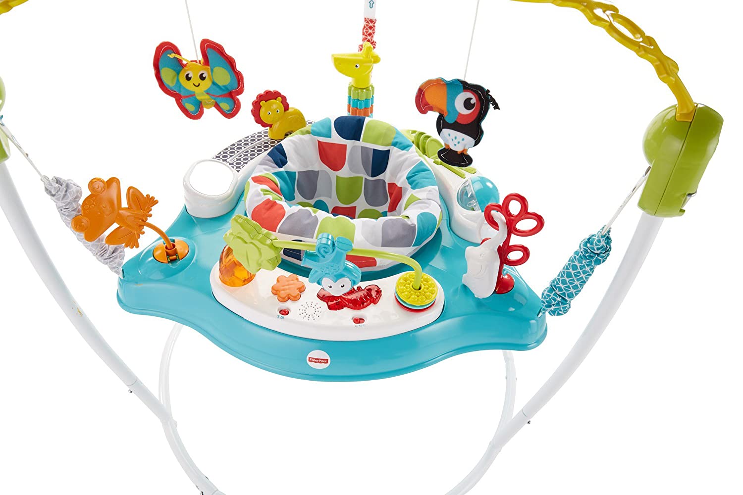 Your baby will love monkeying around in this Jumperoo entertainer and exploring all its fun activities A rotating seat gives little ones 360-degree access to toys, activities and animal friends, including spinners, clackers, a bead bar, a mirror, and so much more. Tiny explorers will love discovering all the fun while music, lights, and sounds reward every jump. Where development comes into play Gross Motor: Jumping, balancing on those tiny toes, and reaching for all the toys & activities helps get your baby's gross motor skills going and growing Sensory: Bright colors, lights, and a variety of sounds and textures help stimulate your baby's visual, auditory and tactile senses. Curiosity: There's so much for your little explorer to discover—from the animal pals "flying" above to their own sweet face in the mirror below Use only with a child who can hold head up unassisted and who is not able to walk or climb out of product.