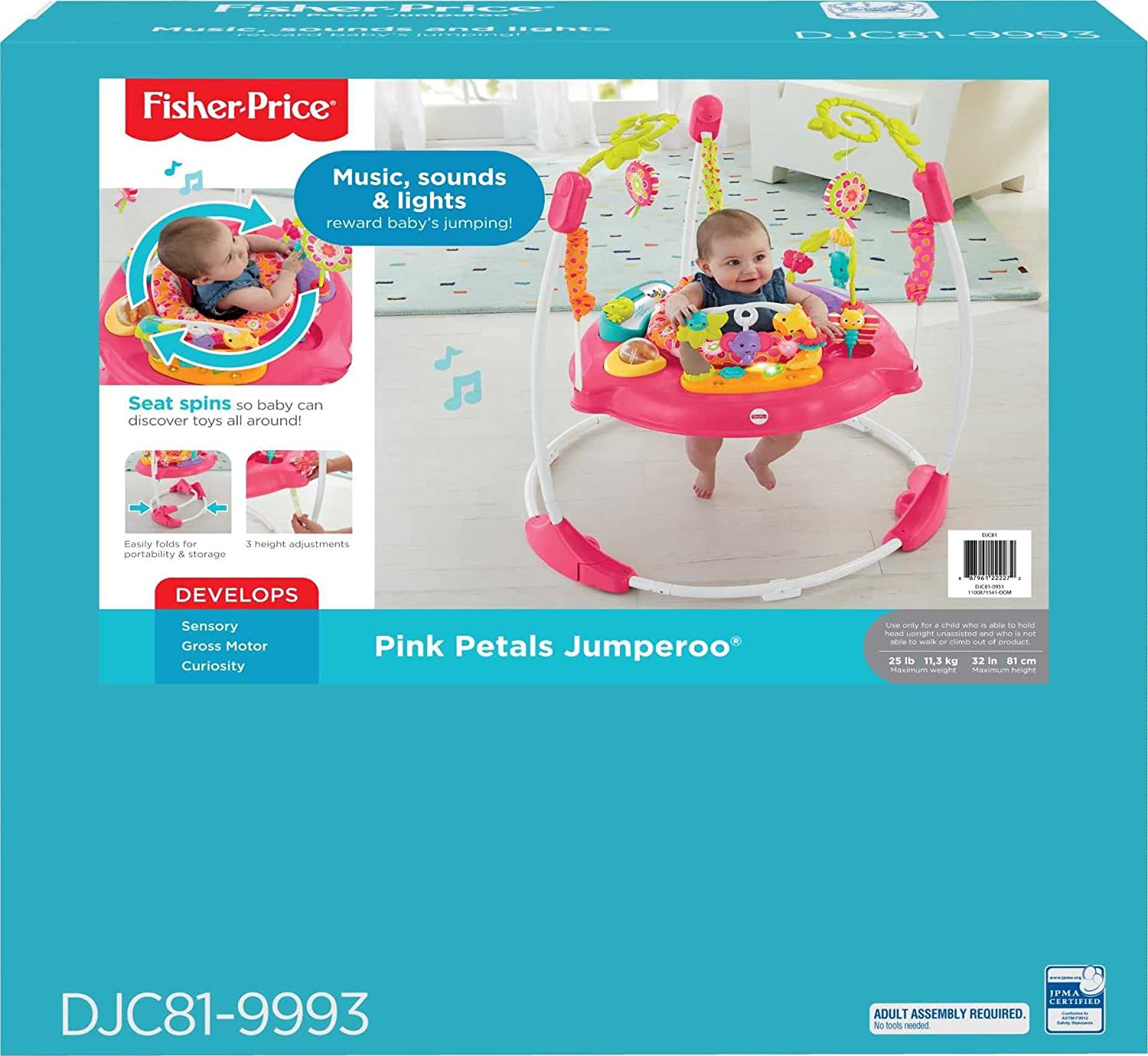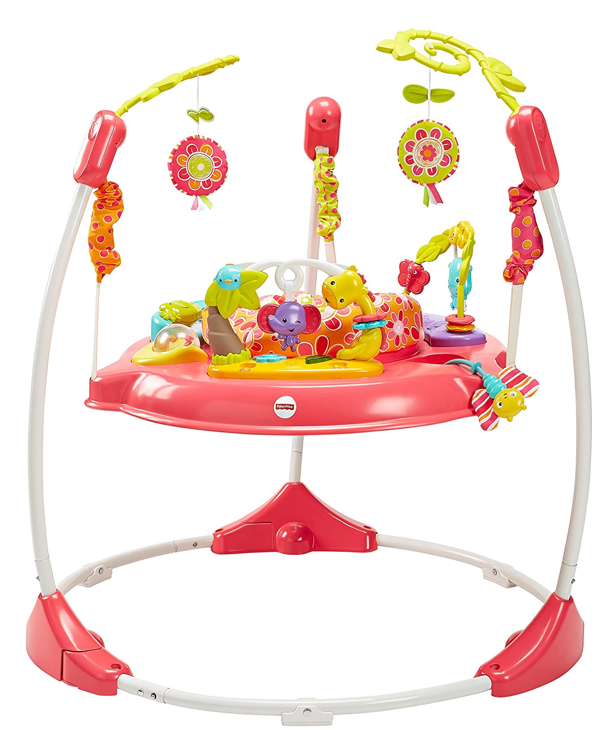 Bounce to the moon and back, all in a day’s worth of playtime. There’s so much for baby to discover with sweet animal friends on this Jumperoo – music, lights and exciting sounds reward baby with every jump! A rotating seat gives baby 360° access to toys, activities and friends all around, including soft flowers overhead, spinners, clickers, a bead bar, mirror and so much more, all within baby’s reach. Baby can reach, grasp, move, groove, and jump so high – all things that give developing motor skills a helpful boost. And it’s easy-peasy to fold for storage and portability.