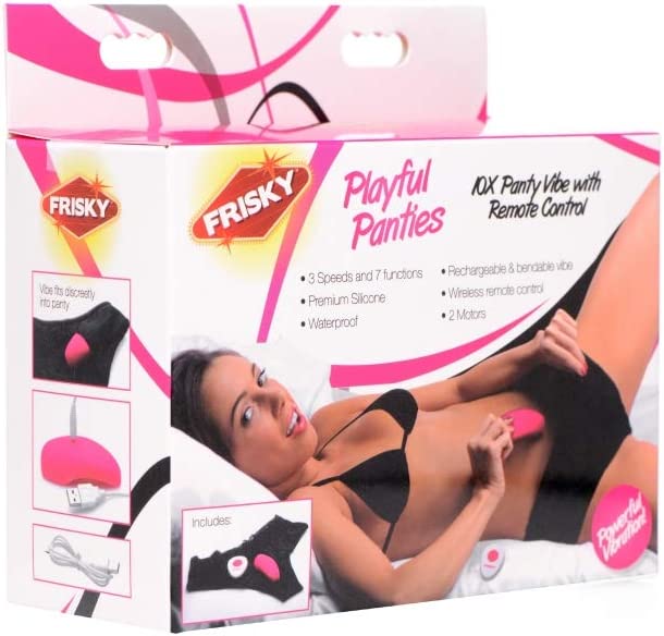 Get frisky with your partner at home or out on a date! This remote control panty set puts the power in your hands while a premium silicone vibrator vibrates within these sexy black panties! The push of a simple button will tease your writhing plaything with 3 speeds and 7 patterns of vibration! Create your own fantasies and bring them to life. The flexible, ergonomically-shaped vibe fits discreetly into the included, stretchy, one-size-fits-many panties or the crotch pocket of many other panties. It can also be used without the remote control and fits comfortably in your palm for a more hands-on approach. This non-porous and phthalate-free material should not be used with silicone lubricants. Clean after use with mild soap or a toy cleaner. Measurements: Panty: Onse size fits most. Vibe: Length is 3.7 inches, Width is 1.5 inches. Material: Silicone, ABS Plastic, Spandex fabric. Color: Pink. Note: Charges via USB. Remote control requires 1 CR2032 cell battery, included.