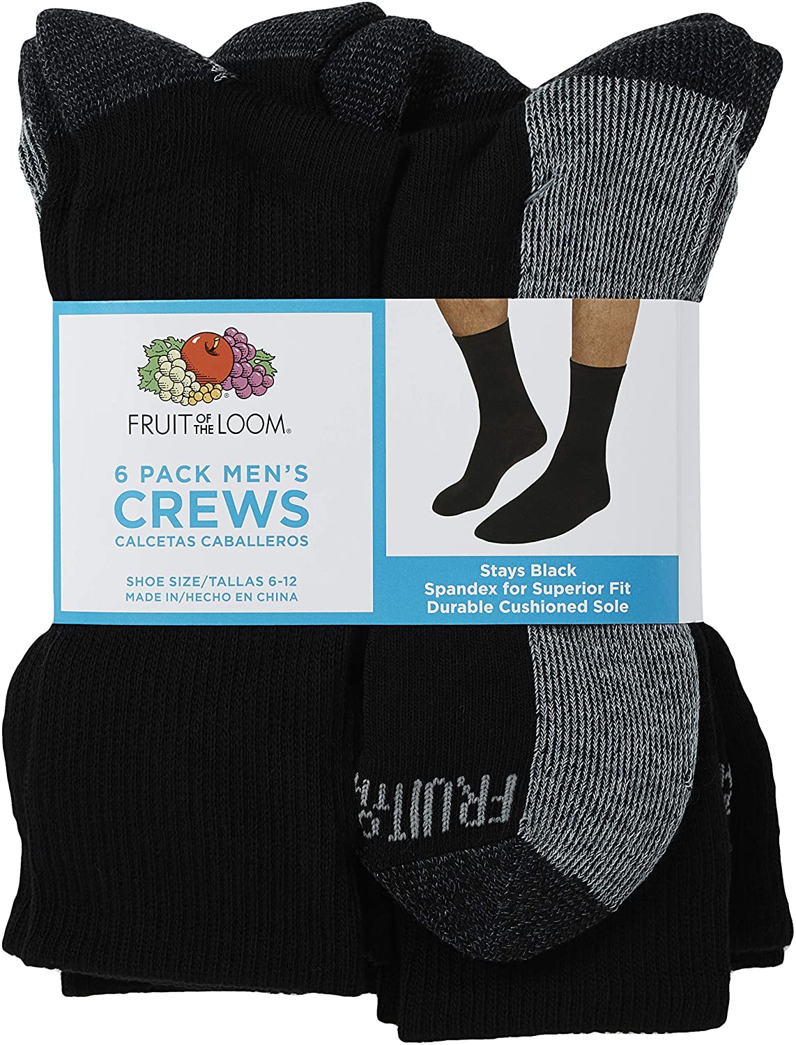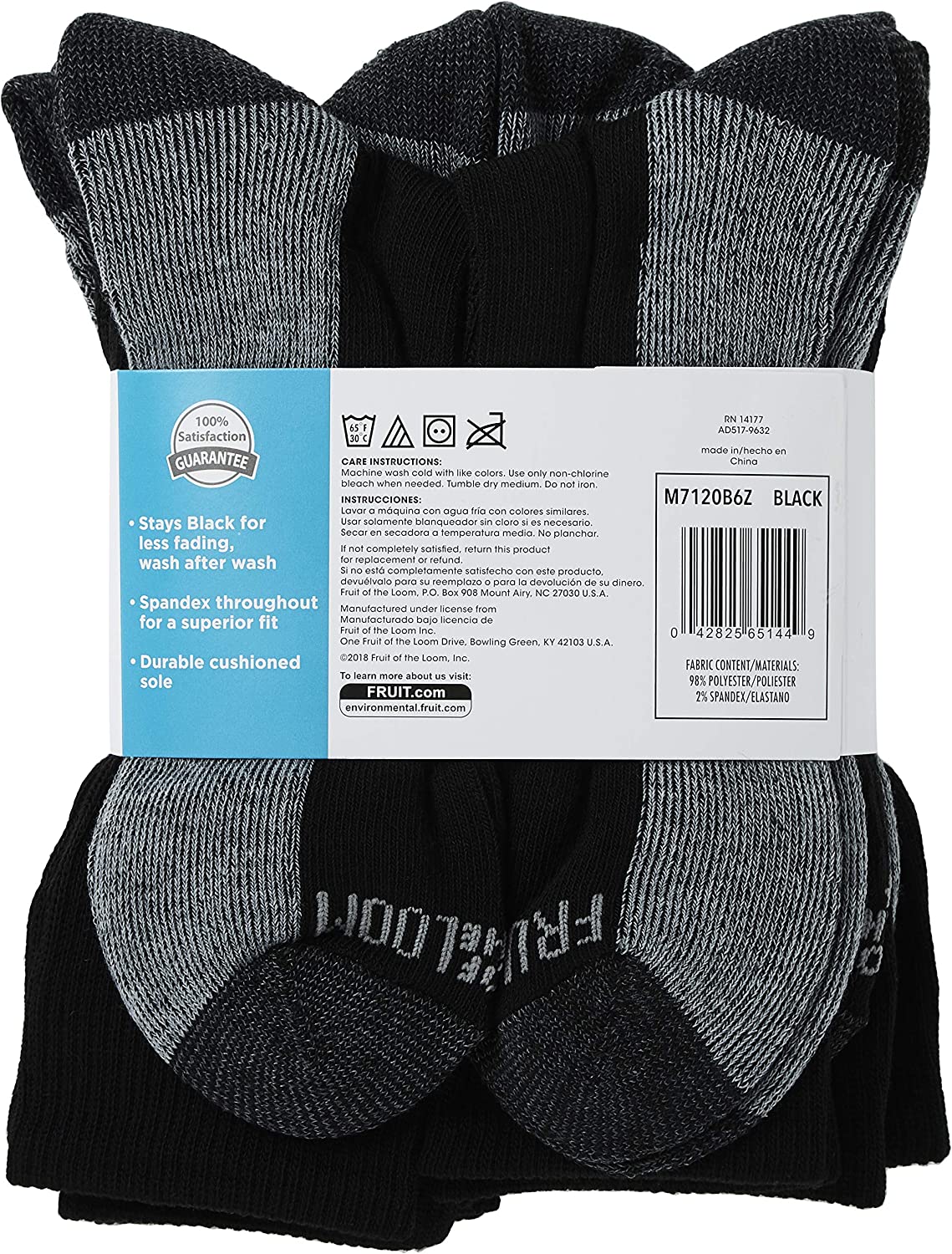 Fruit of the Loom socks are comfortable, affordable, and built to last. These men's crew socks feature arch support, a durable gray cushioned sole, and spandex throughout. The black silhouette features stays black fabrication. 6 pairs per package. Fits men's shoe size 6-12.